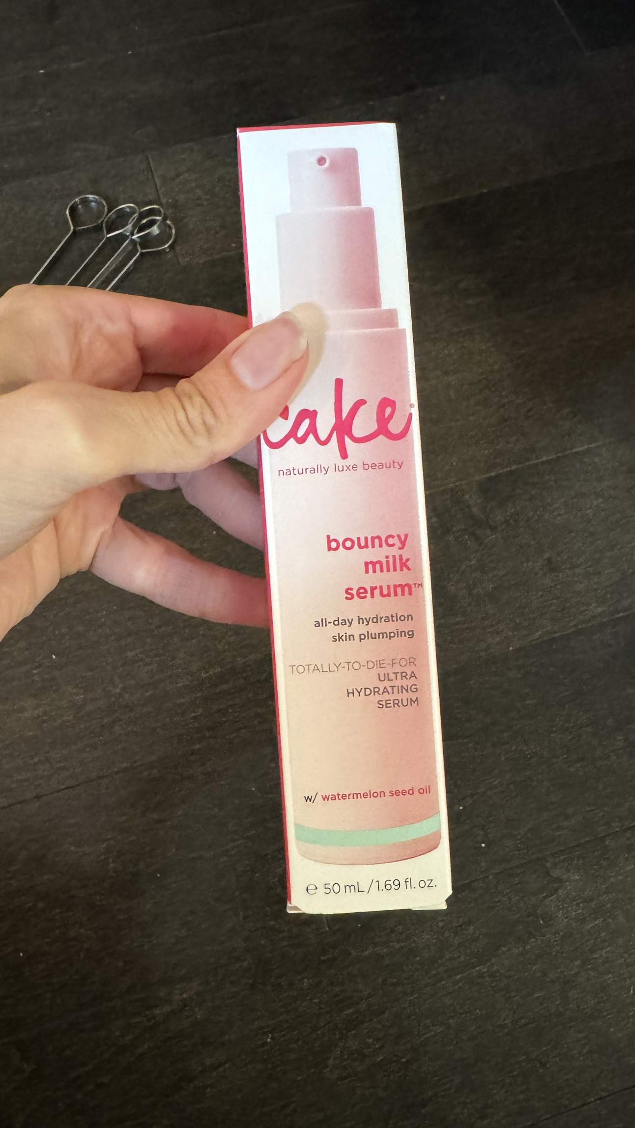 A brand new bottle of Cake Bouncy Milk Serum. It is an all-day hydration serum that is designed to plump the skin. It contains watermelon seed oil. The size of the bottle is 50 ml.