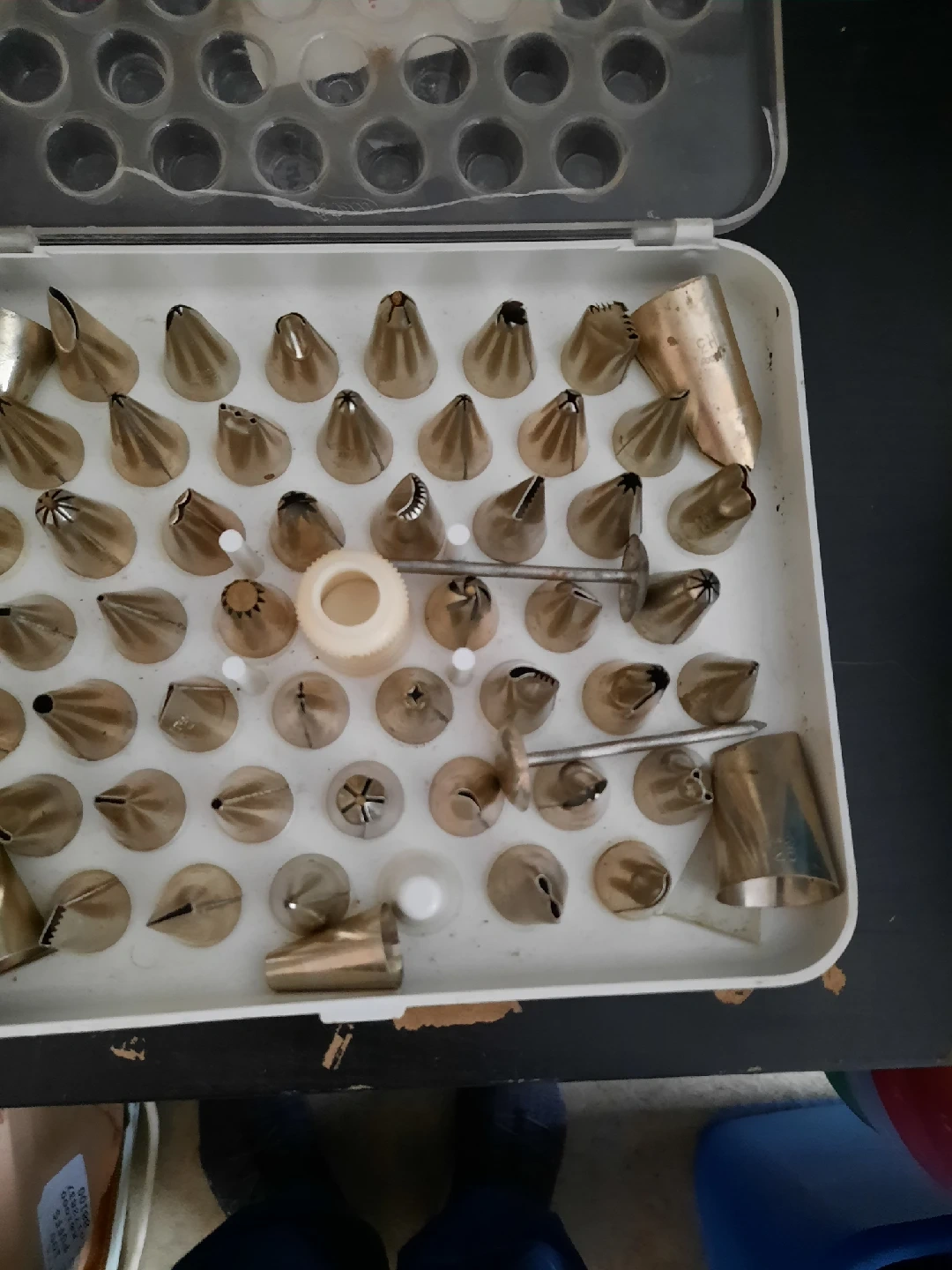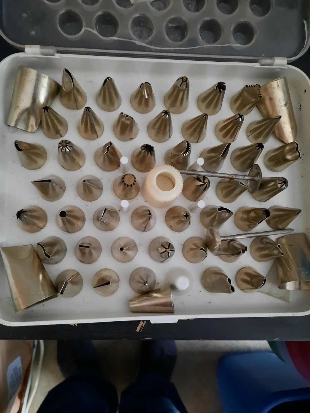Selling a professional set of 50 cake decorating tips! complete with nails in a plastic box To make individual flowers includes a variety of tips for different designs and patterns. Perfect for the professional cake decorator or anyone starting a career or who enjoys baking and decorating cakes original price $ 175 only available for pickup