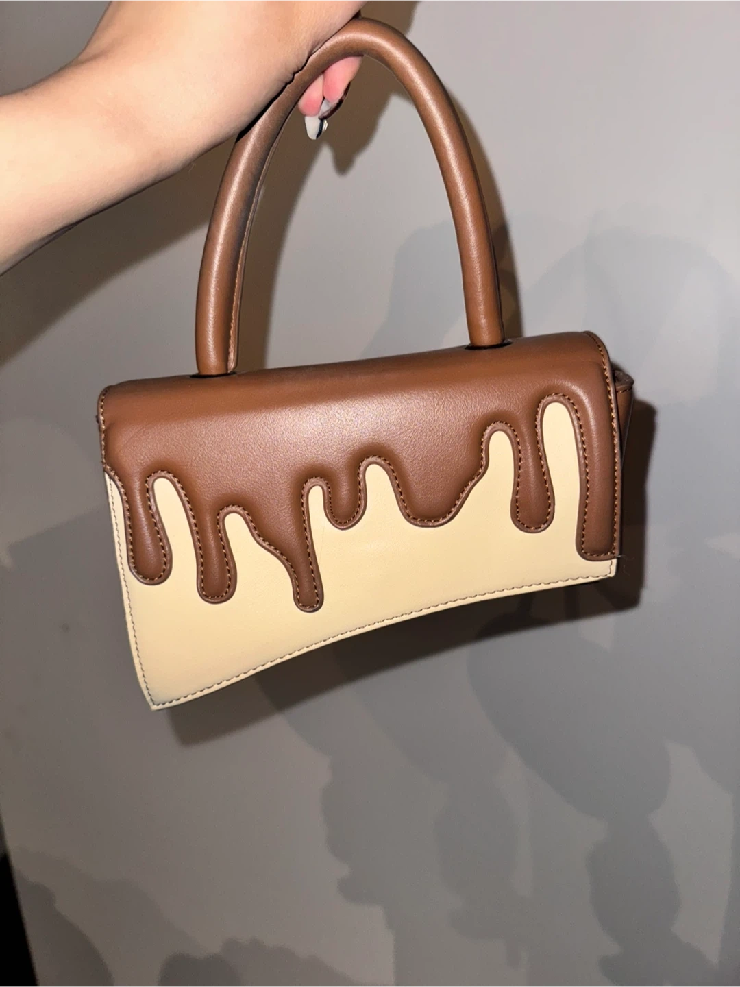 Super cute handbag with a unique cake-inspired design! It's brown and beige and has a handle on top. Perfect for adding a touch of whimsy to any outfit