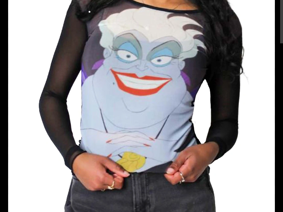 Cute Ursula graphic mesh top! It's a fun piece to add to your wardrobe. The mesh material is lightweight and breathable, perfect for layering or wearing on its own. It features a bold print of Ursula, making it a unique and eye-catching top New without tags Cakeworthy Ursula sea witch from Disney Little mermaid Size 3X