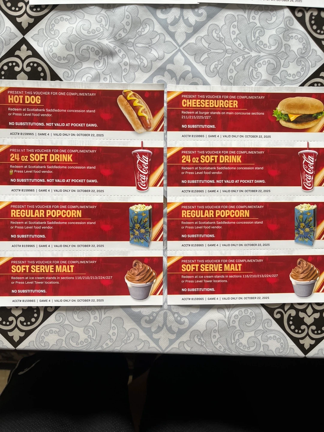 2 seats and 2 vouchers for Flames Games. Prices vary. Section: PL13, Row: 10, Seats: 15 & 16 (right on the isle) FOOD VOUCHERS INCLUDED IN PRICE! All food vouchers offer free food that would cost a lot if bought regularly such as: 1 free cheeseburger, 1 free hot dog, 2 free 24oz soft drinks, 2 free regular popcorns, 2 free soft serve ice creams Games available and total cost: St. Louis Blues - Oct. 11 ($150) - SOLD! Montreal Canadiens - Oct. 22 ($250) New York Rangers - Oct. 26 ($200) Columbus Blue Jackets - Nov. 05 ($150) San Jose Sharks - Nov. 13 ($150) Seattle Kraken - Dec. 18 ($150) Pittsburgh Penguins - Jan. 21 ($200) Toronto Maple Leafs - Feb. 02 ($300) Ottawa Senators - Mar. 05 ($200) Tampa Bay Lightning - Mar. 22 ($200)