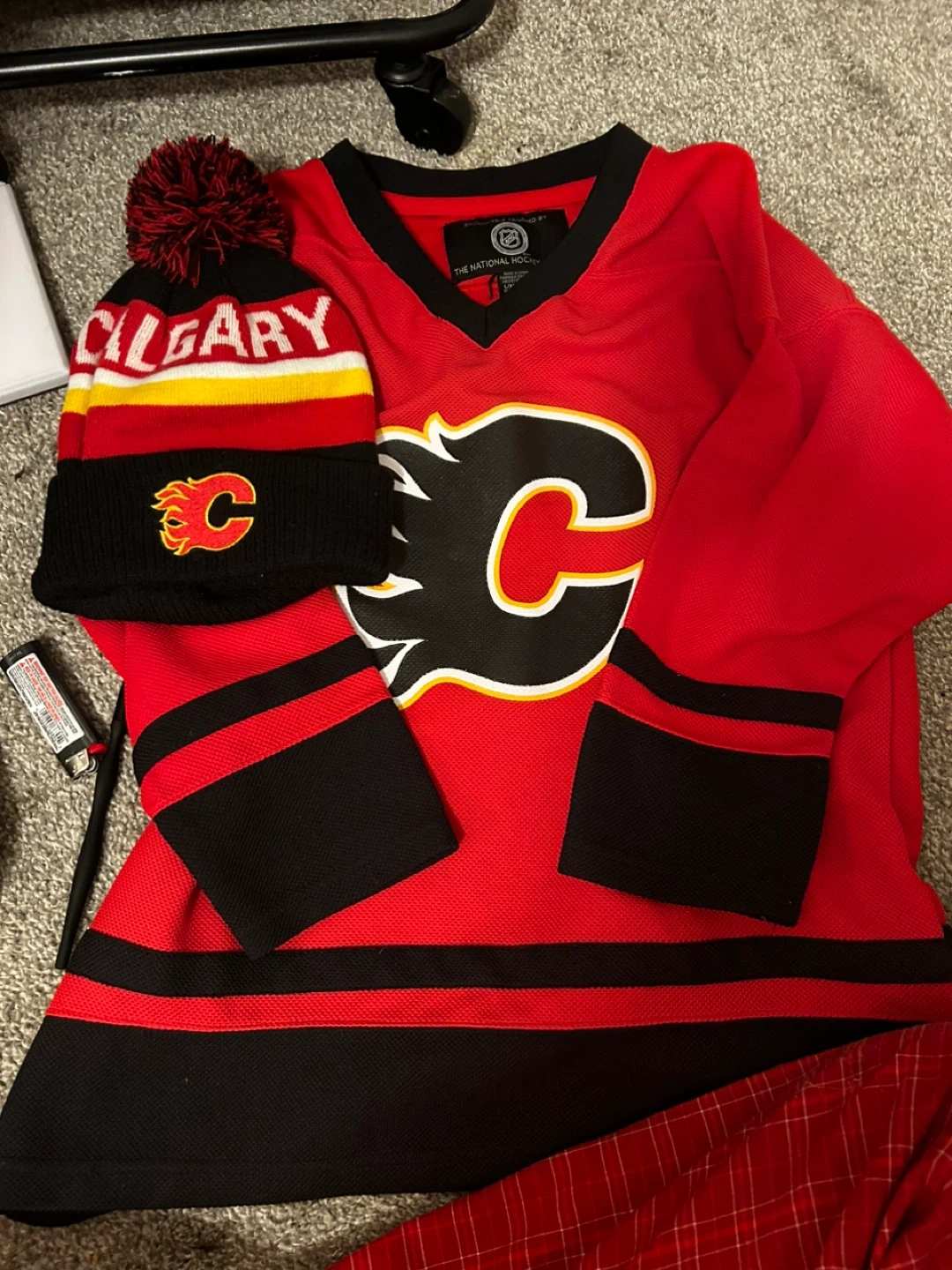Selling a Calgary Flames jersey with a matching toque. Both items are in great condition and ready for a new fan! Perfect for showing your team spirit at the next game or around town