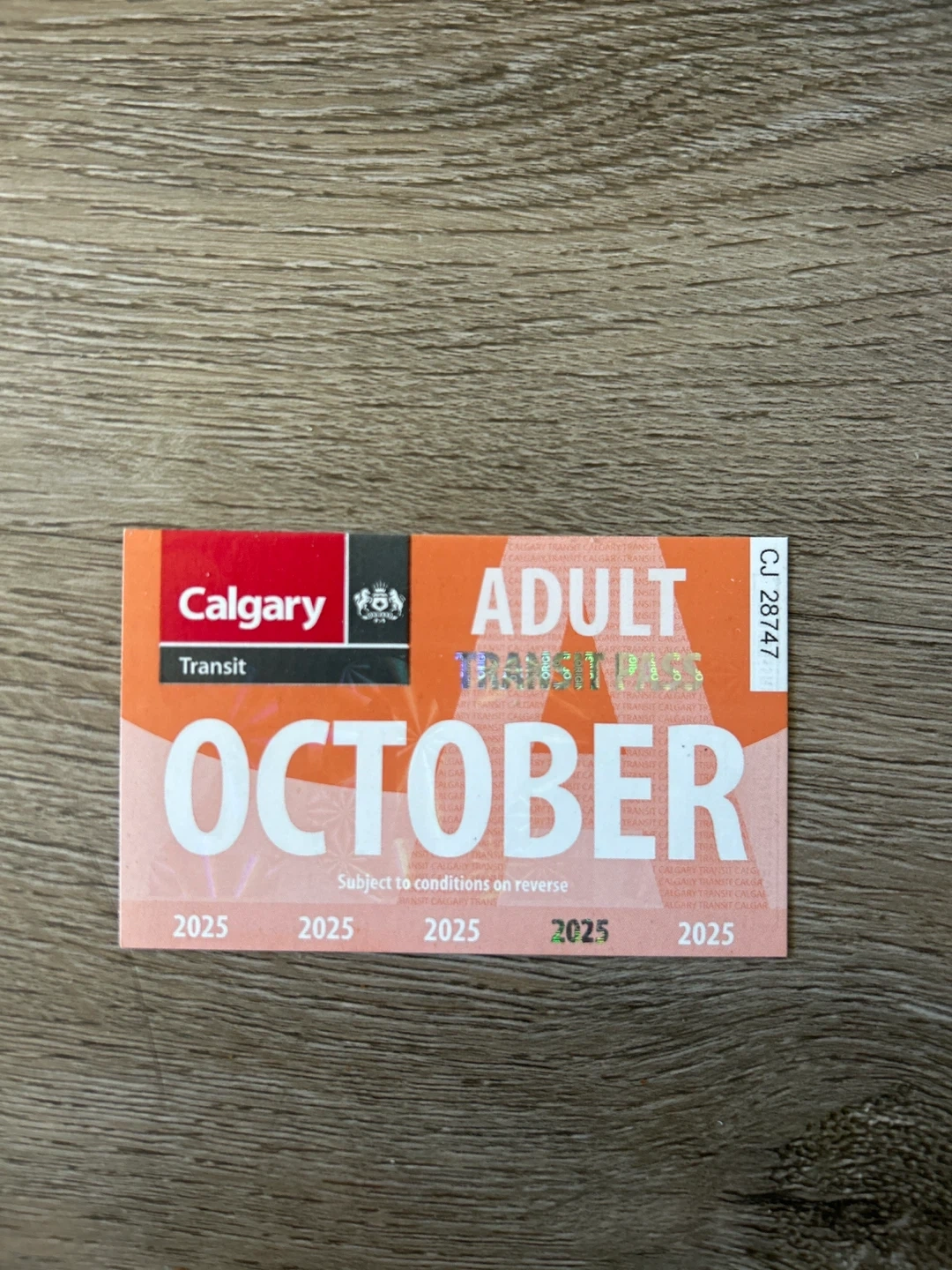 Selling a Calgary Transit adult pass for October 2025! This pass is valid until October 2025, so you'll be able to get around Calgary easily