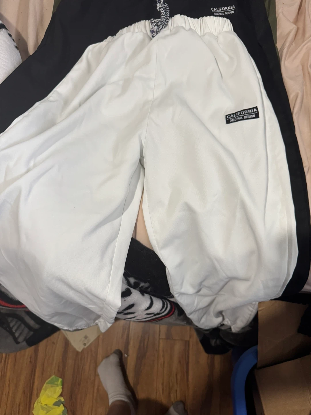 These are a pair of white green and black pants with the text "CALIFORNIA ORIGINAL DESIGN" on the front. They look to be in good condition and ready for a new home!