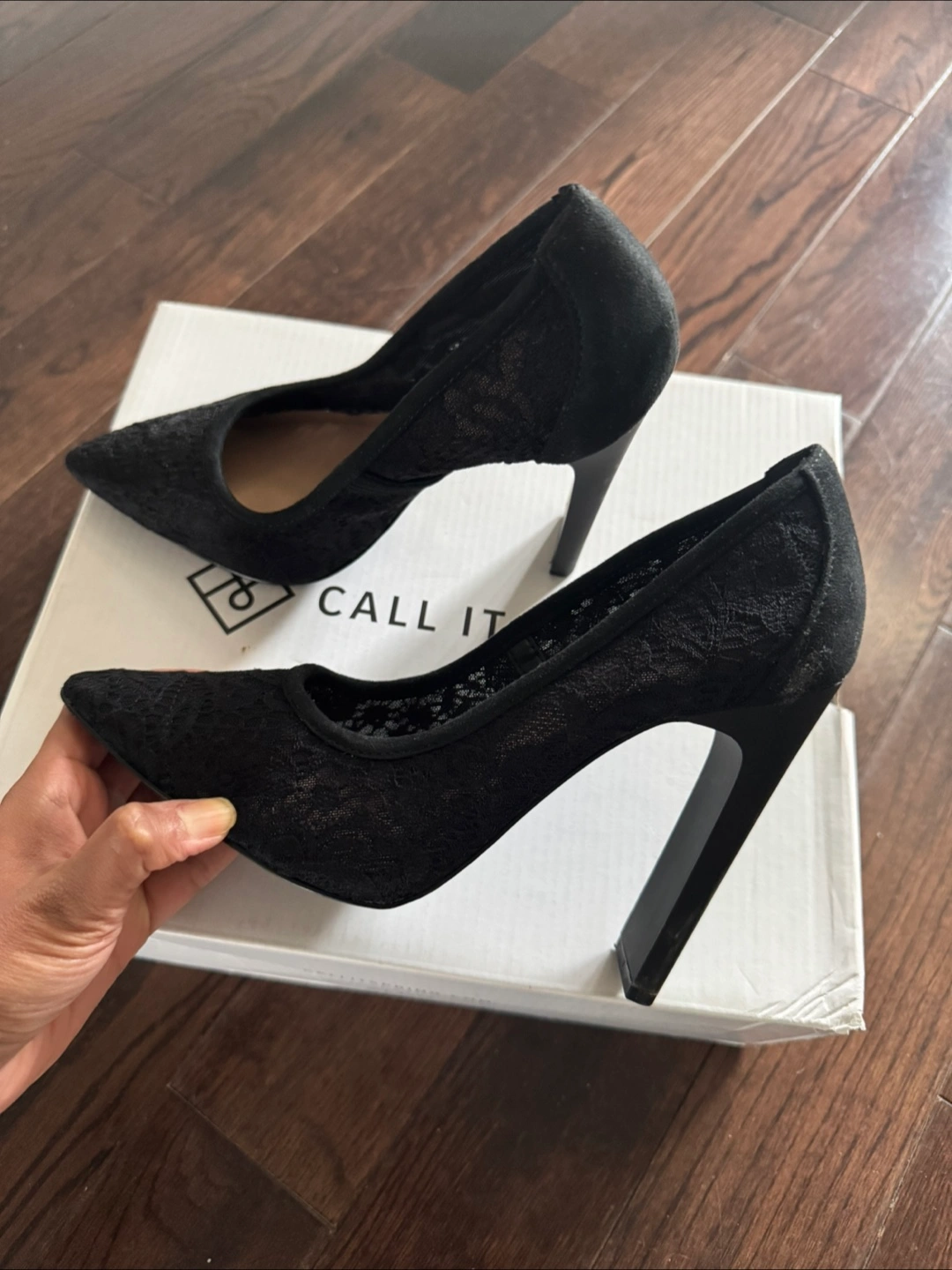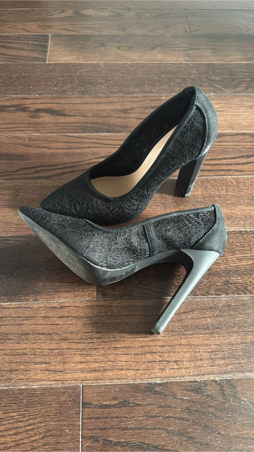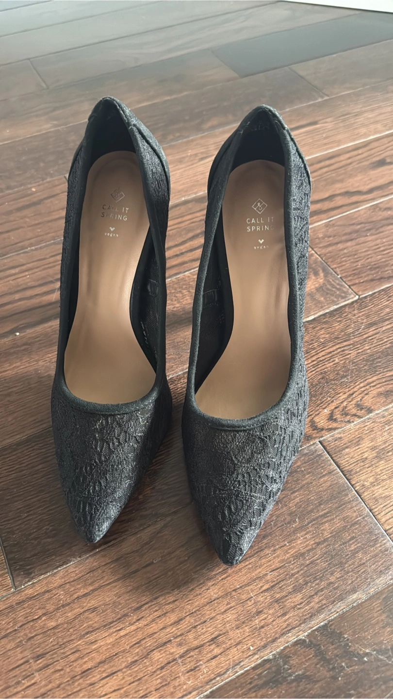 These are a pair of black heels from Call It Spring. They feature a lace design and would be a great addition to your wardrobe