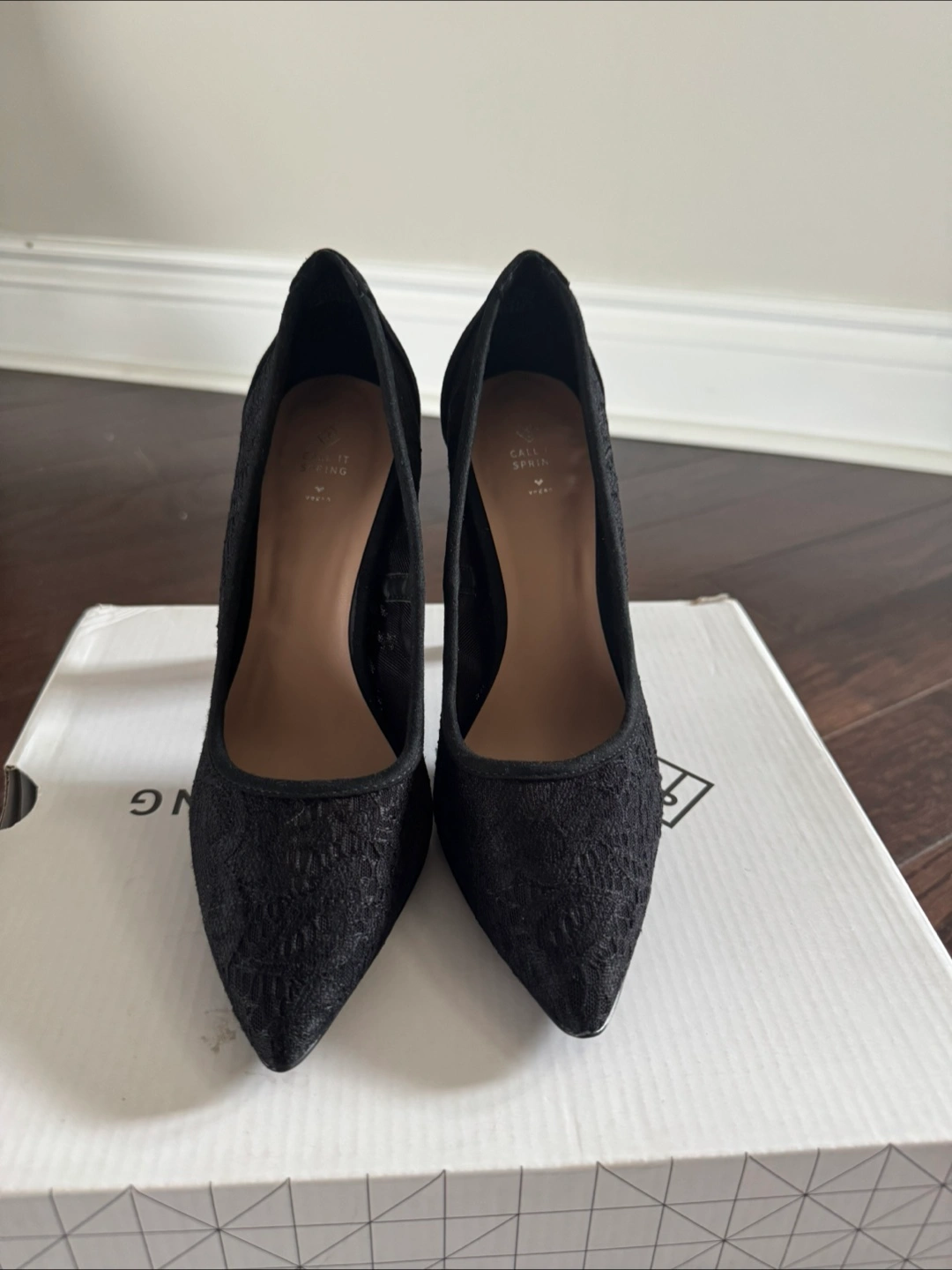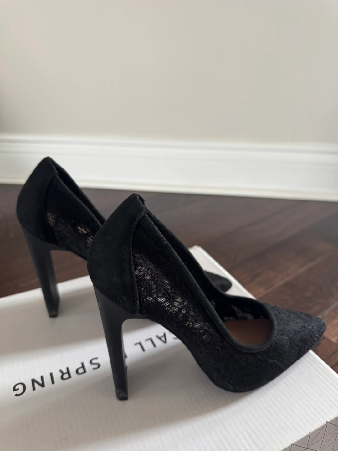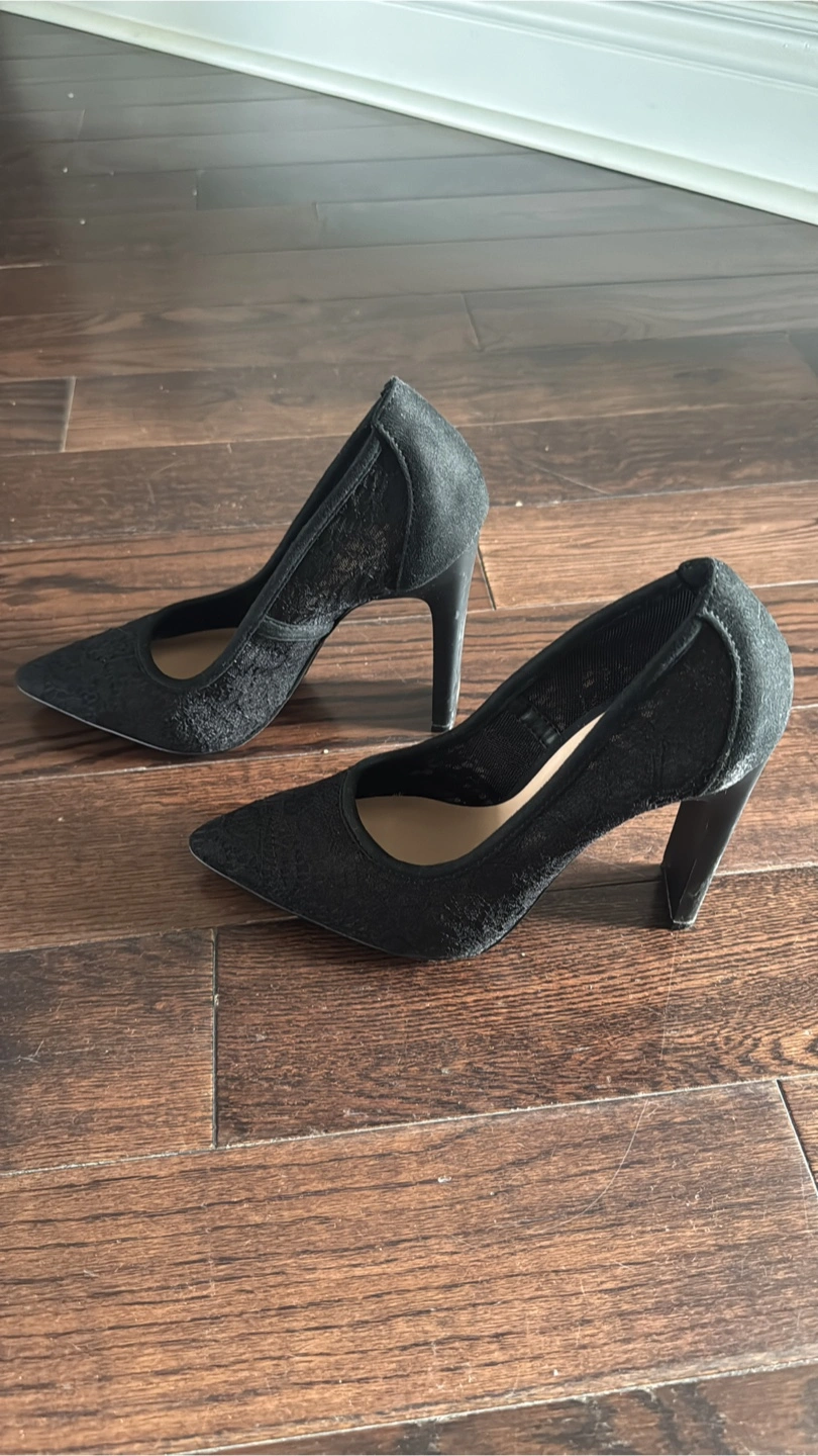 These are a pair of black heels from Call It Spring. They feature a lace design and would be a great addition to your wardrobe