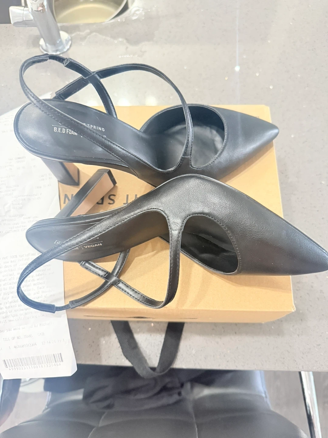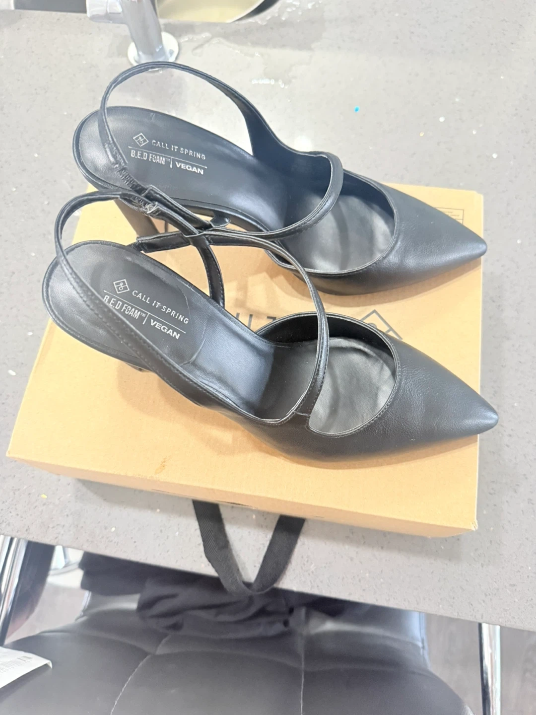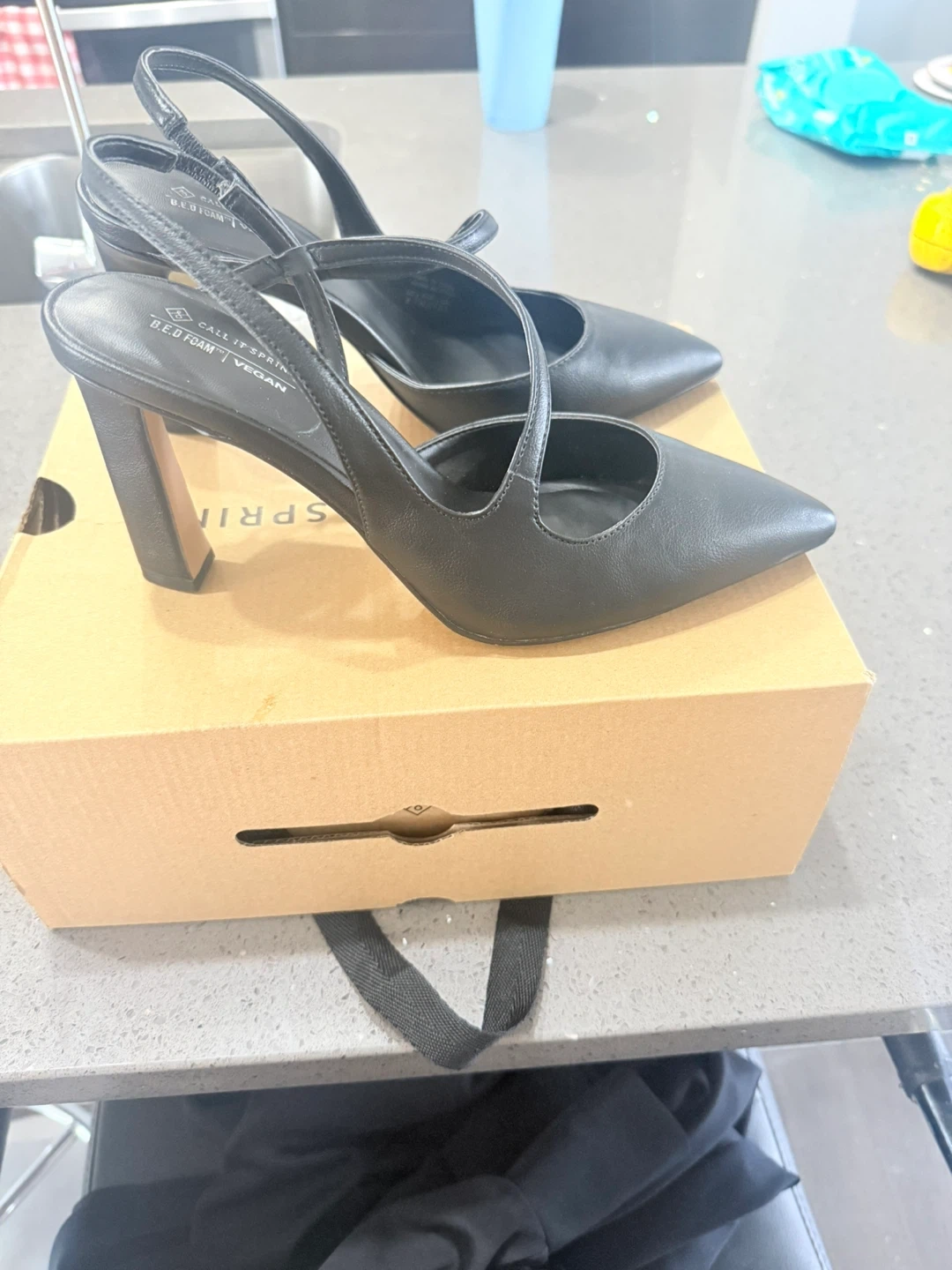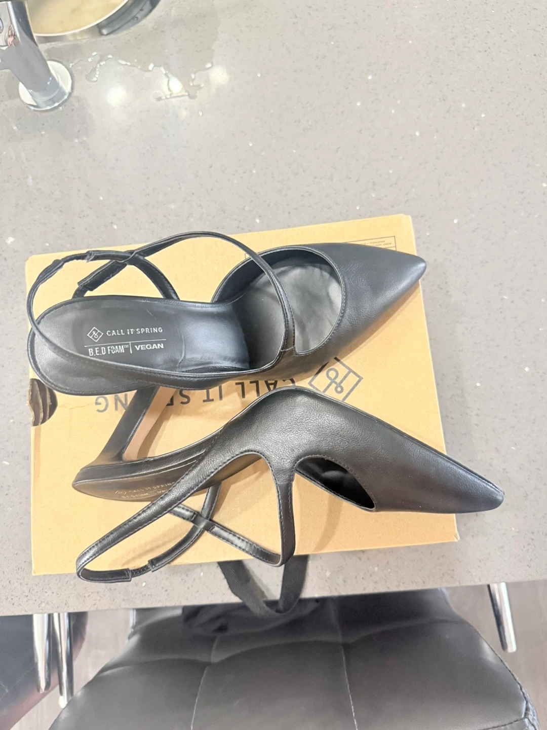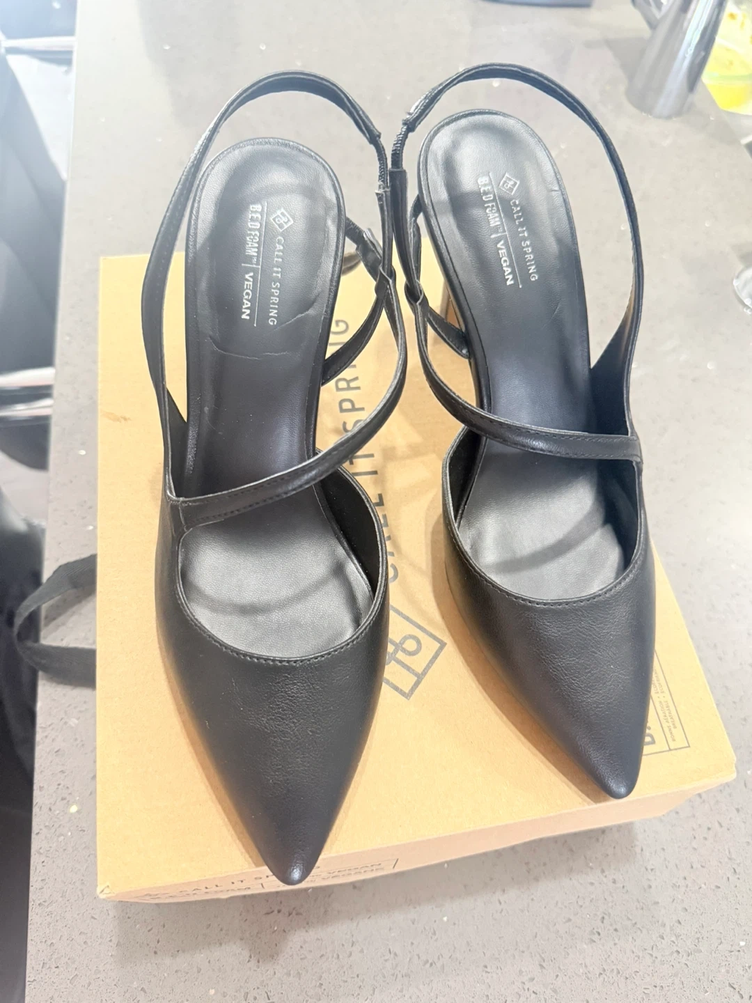 Selling a pair of Call It Spring black heels in size 8. They are in great condition and come with the original box. These heels feature a vegan B.E.D Foam insole for extra comfort. Perfect for a night out or a special occasion!
