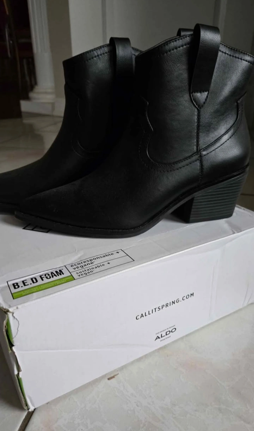 Women's black ankle boots. Pointed toe and block heel. Vegan leather. B.E.D. Foam insole for comfort. New with box.