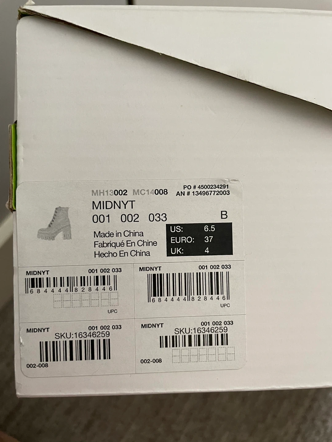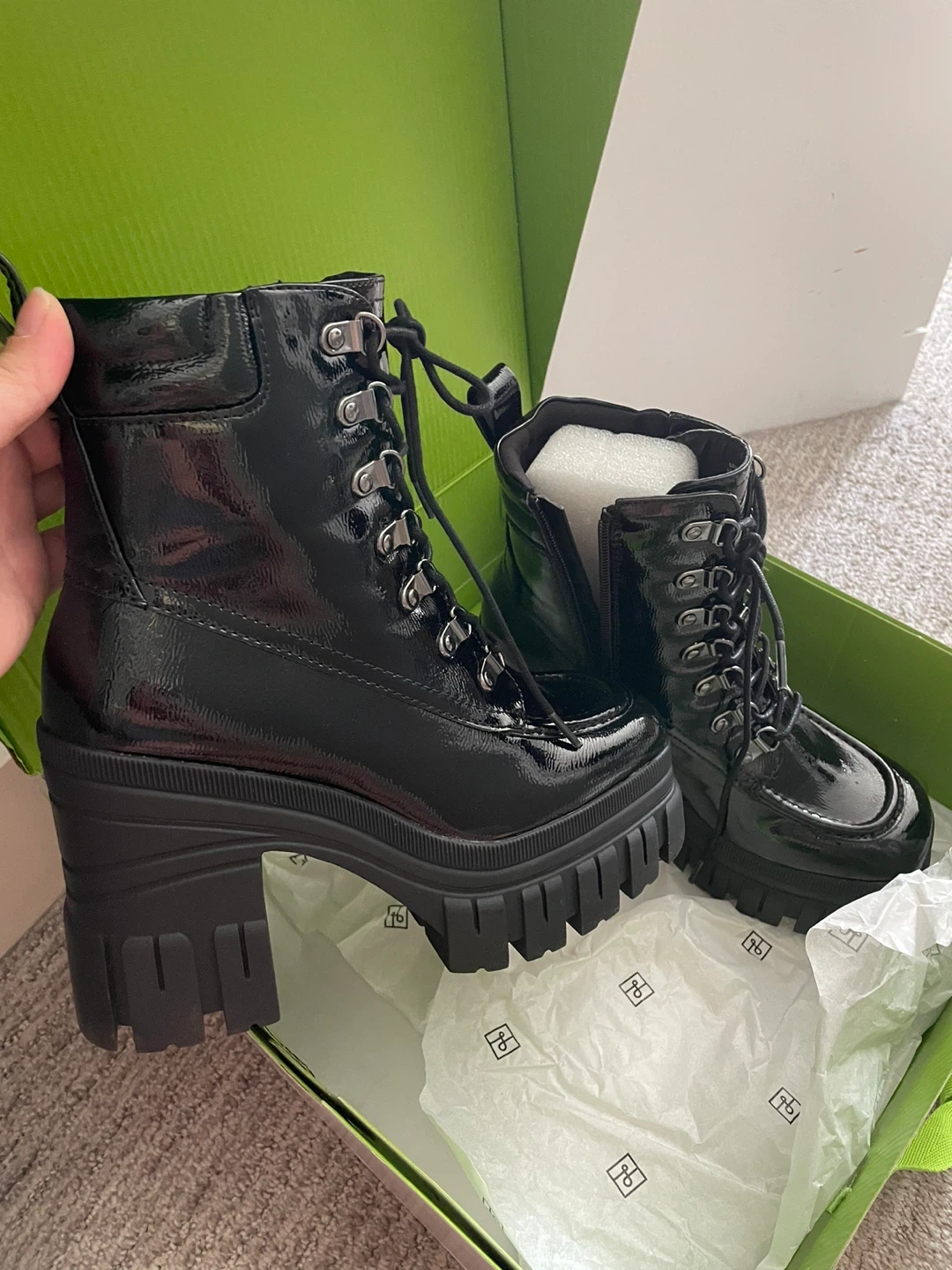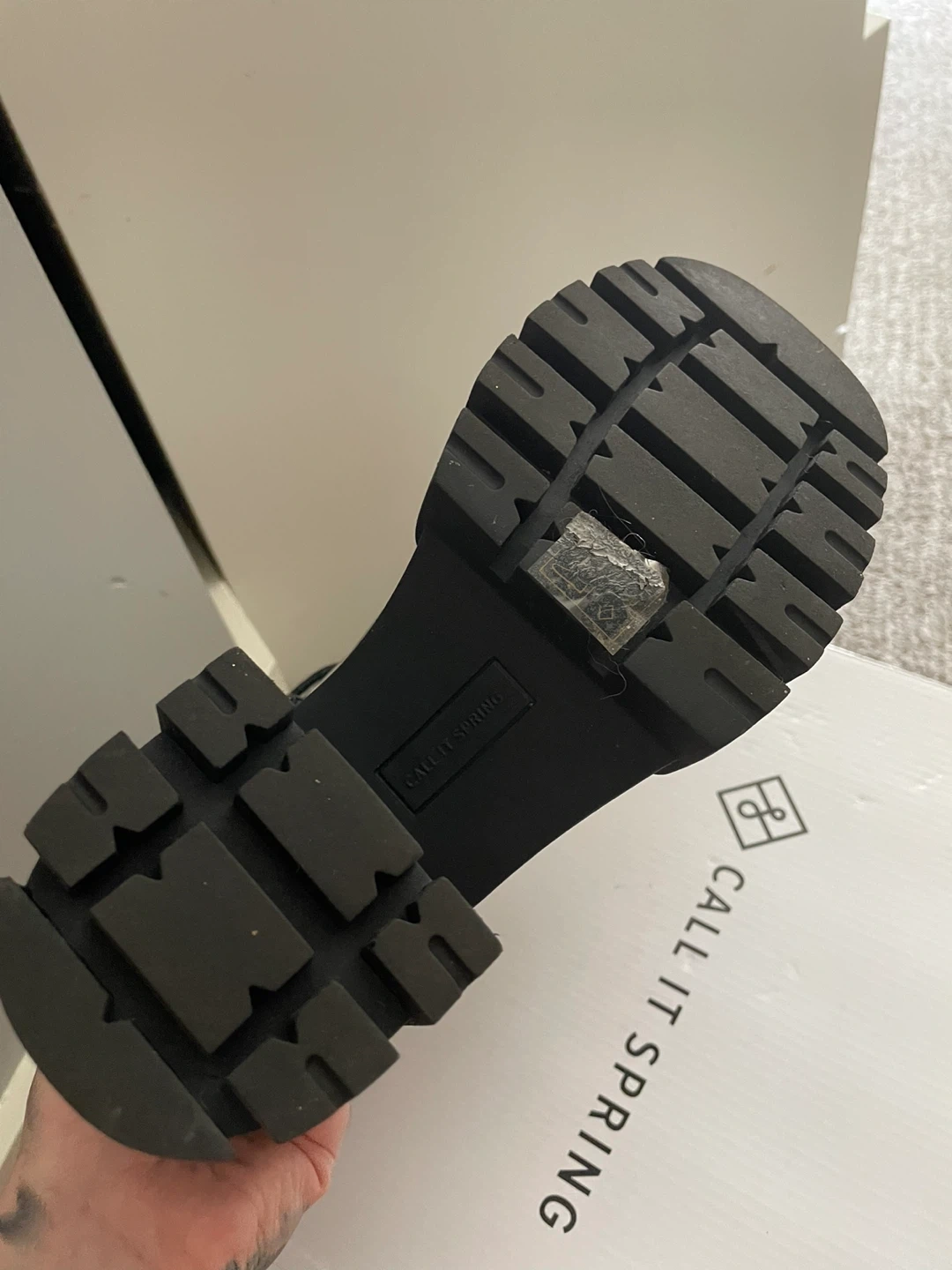 Selling a pair of Call It Spring Midnyt boots in black, size 6.5. They come with the original box. These boots are eco-responsible and vegan! They have a chunky, lug sole.
