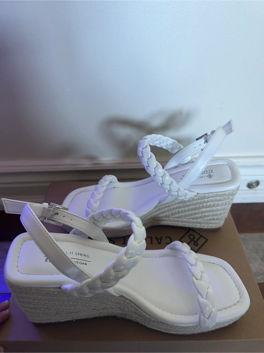 Stylish and super comfortable sandals. Worn only once, indoors for a few hours. Size 38 These are a cute pair of white wedge sandals from Call It Spring. They are vegan and have a braided strap detail. Comes with the original box!
