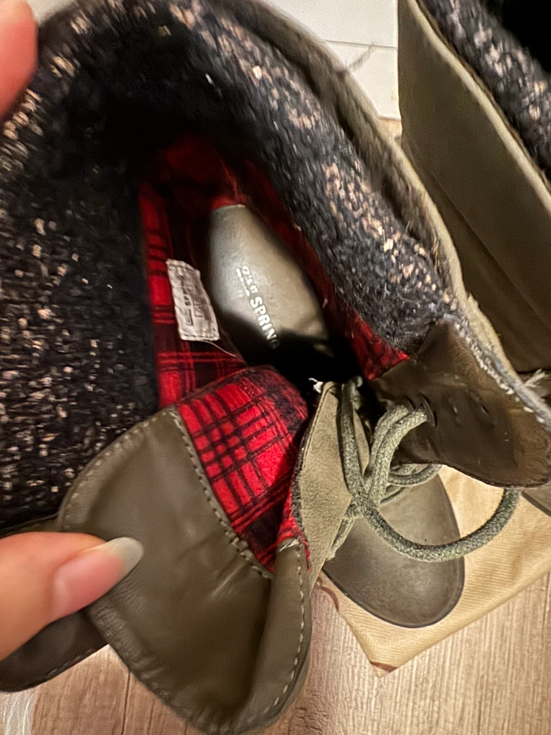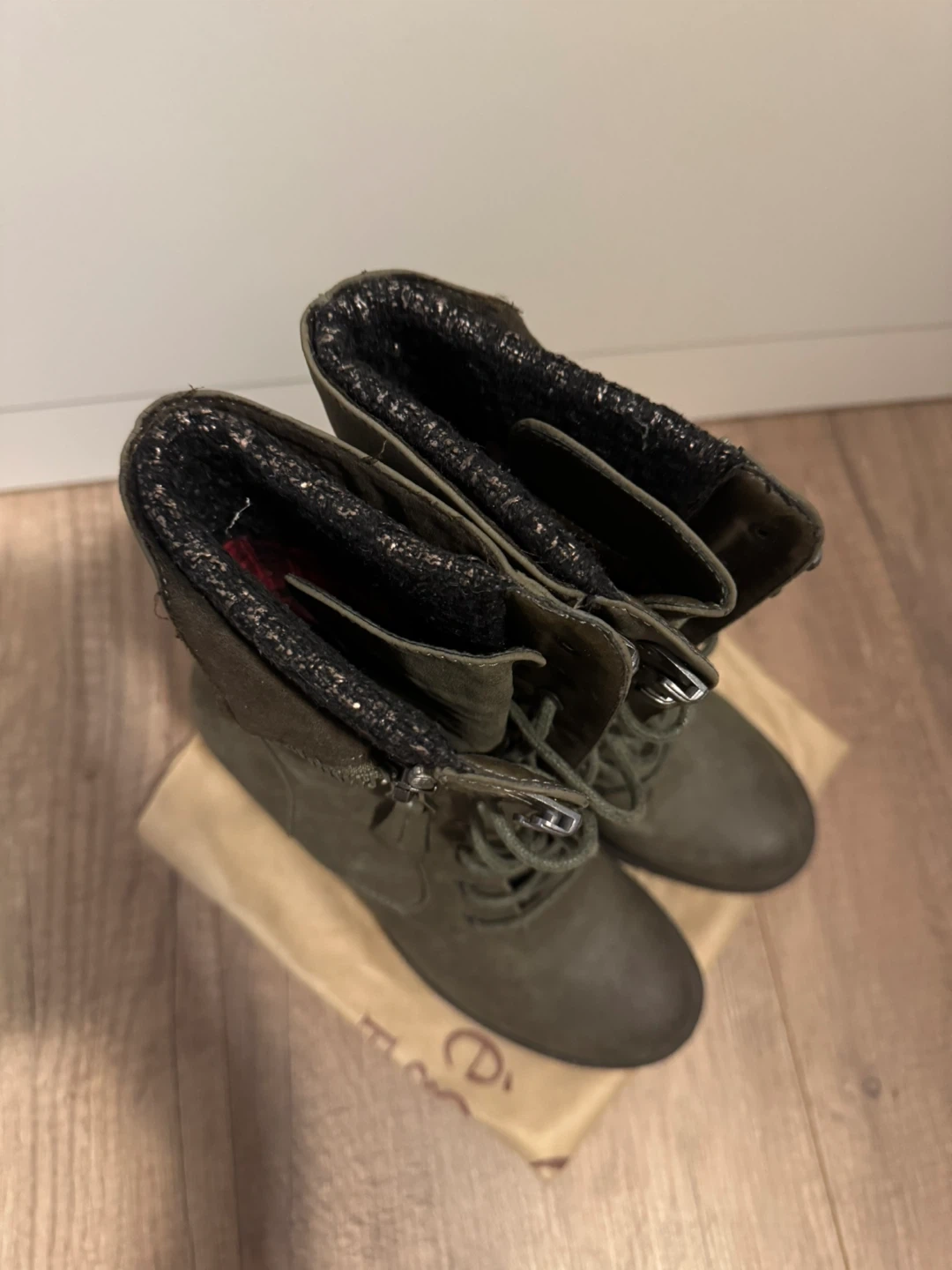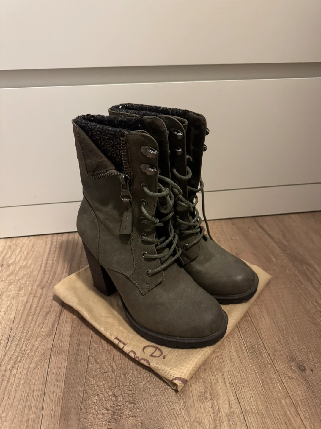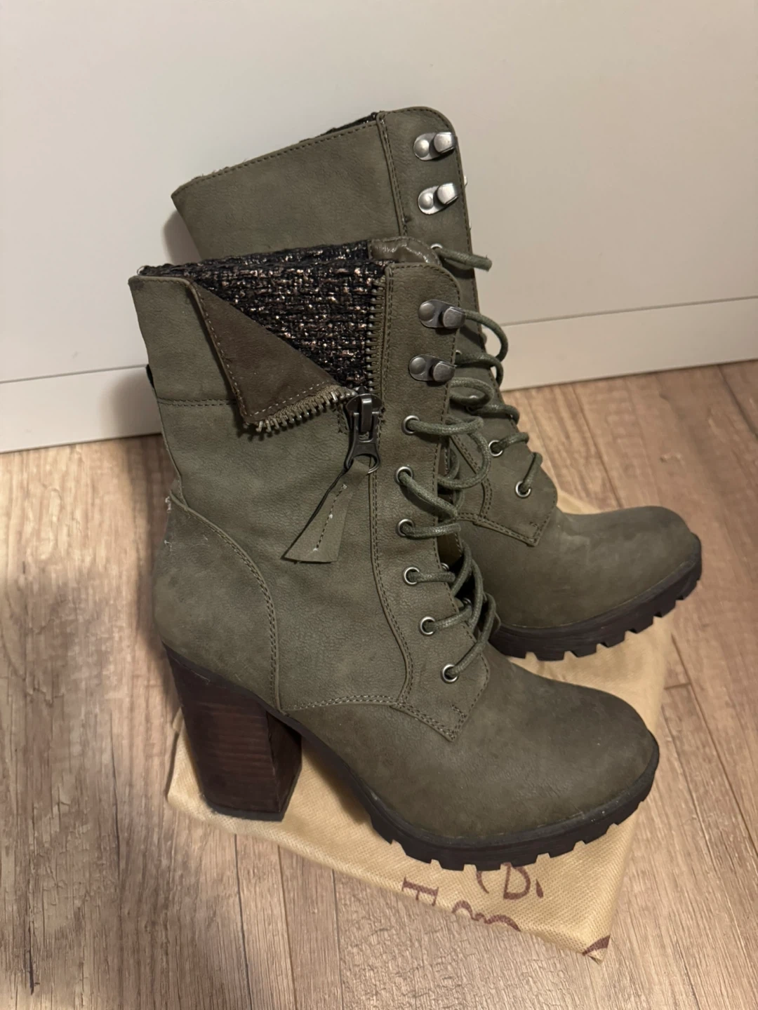 These olive green combat boots from Call It Spring are in great new condition! They feature a lace-up front and a stylish heel, perfect for adding a bit of edge to any outfit