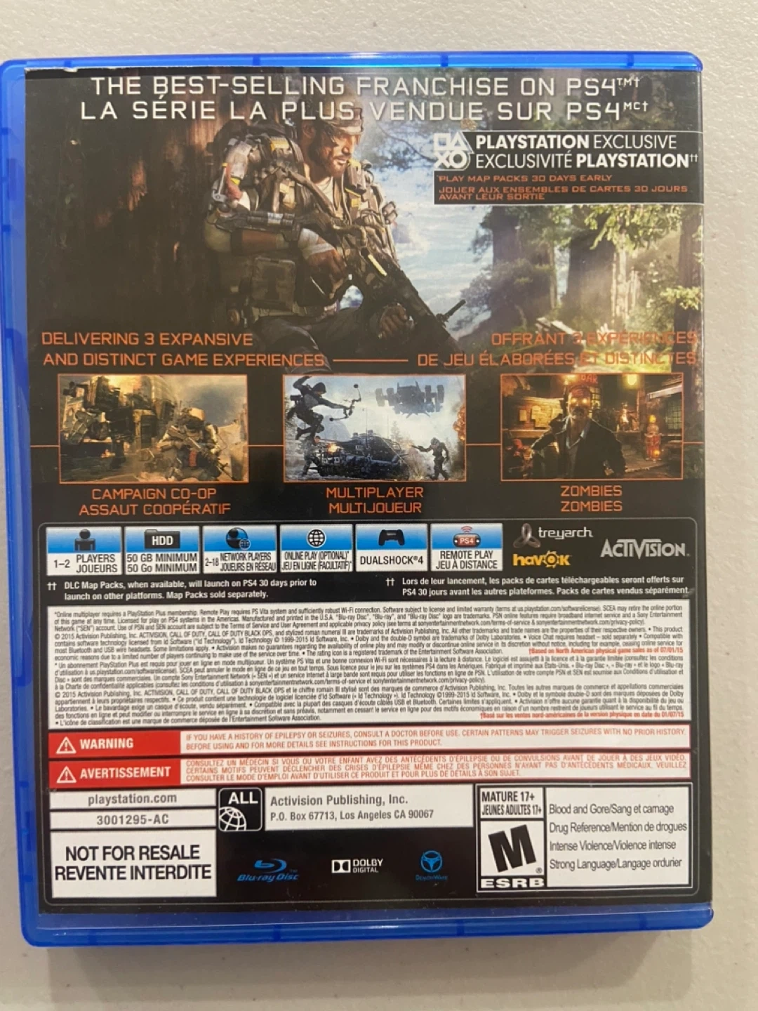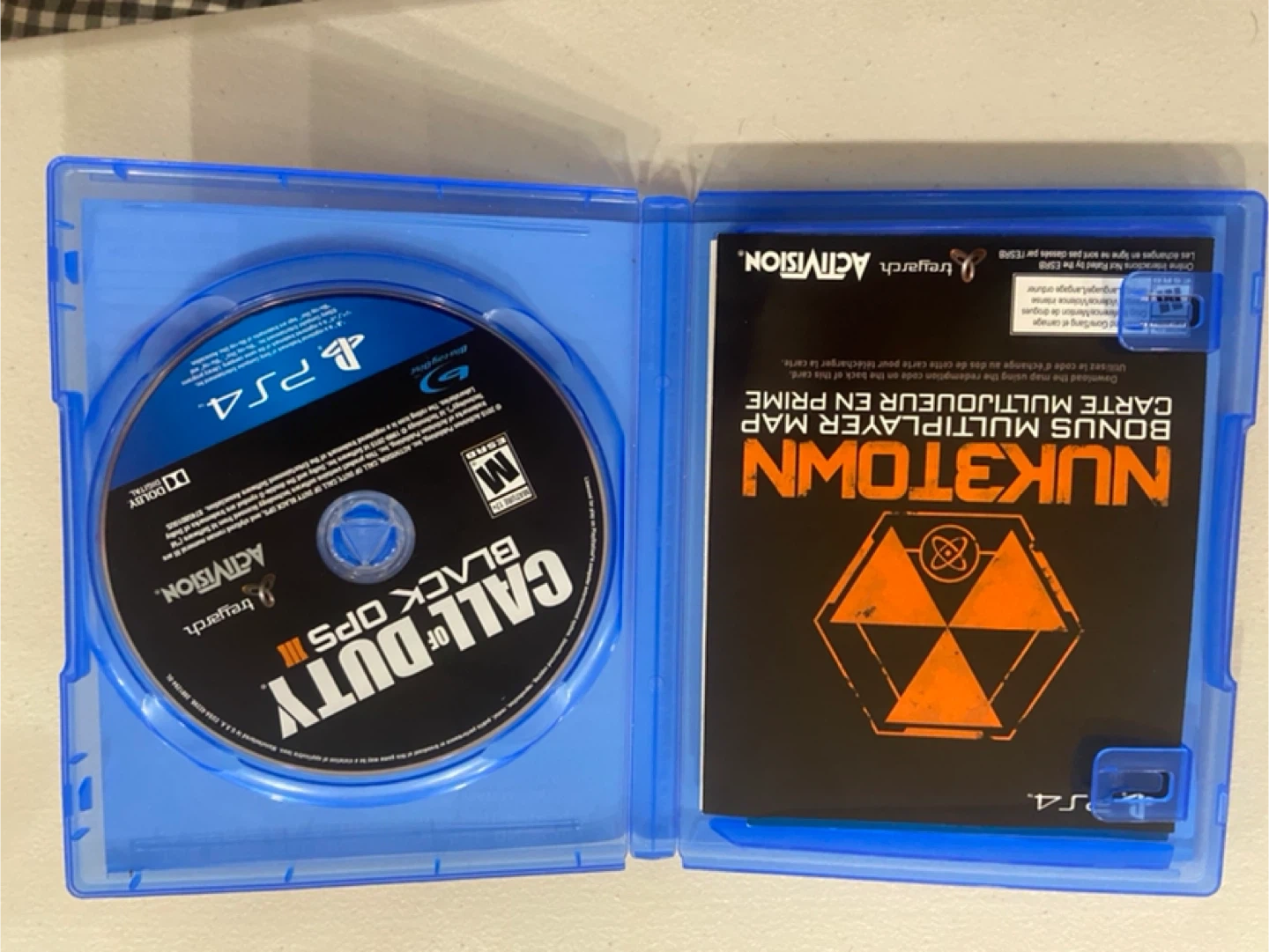 Selling Call of Duty: Black Ops III for the PlayStation 4! This game delivers 3 expansive and distinct game experiences. It also includes the NUK3TOWN bonus multiplayer map. Get ready for some intense zombie action and multiplayer battles!