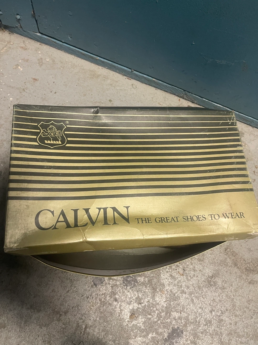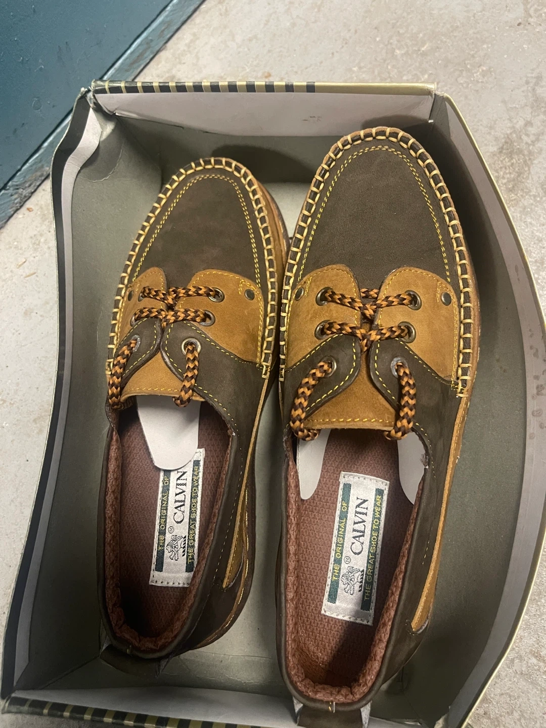 Selling a pair of Calvin brown leather shoes. They come in their original box. The shoes are size 40 and feature a unique lace design. They have some wear on the soles, but are otherwise in good condition