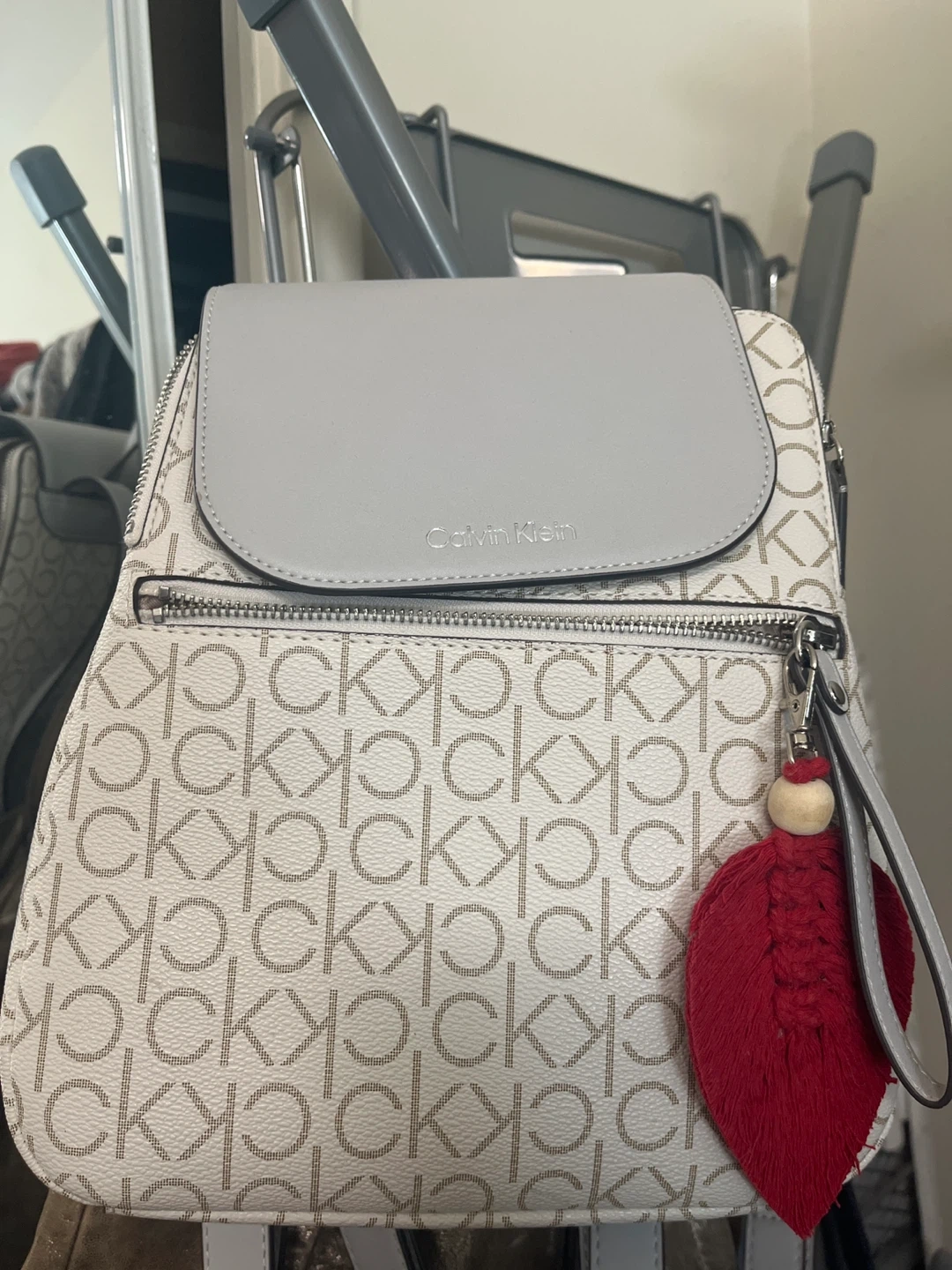 Selling a Calvin Klein backpack with a light grey and beige colour scheme! It has the CK logo printed all over. There is also a red tassel attached to the zipper.