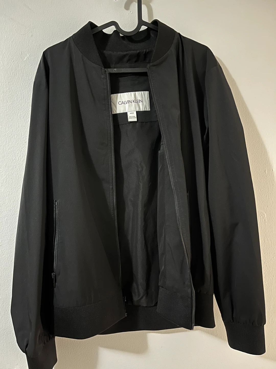 Selling a stylish Calvin Klein bomber jacket in black! It's a size small and in great condition. Perfect for layering or wearing on its own. The jacket features a classic bomber design with a zip-up front and ribbed cuffs and hem. Great for a casual yet put-together look.