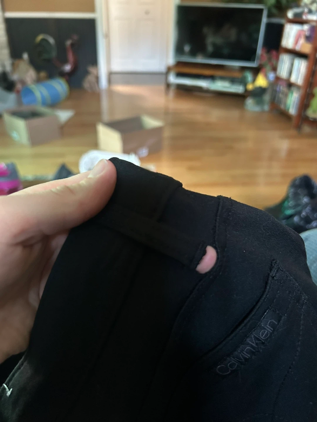 Selling a pair of black Calvin Klein pants. They're in great shape except for a small hole below a belt loop.