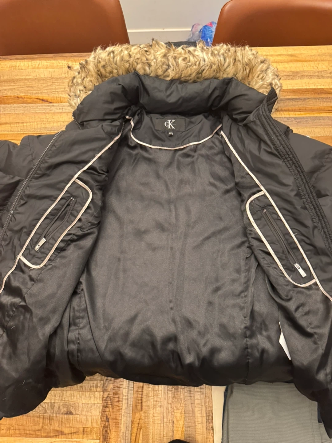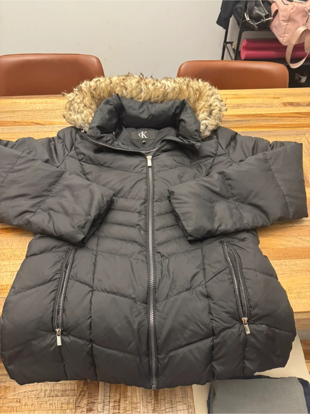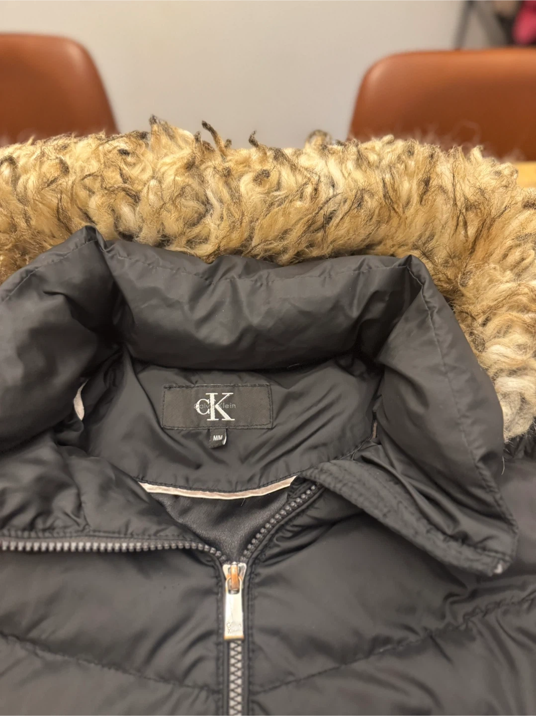 Selling a Calvin Klein black puffer jacket. It's in great condition and has a faux fur-trimmed hood. The size is M/M (Medium/Medium). It's perfect for staying warm during the colder months!