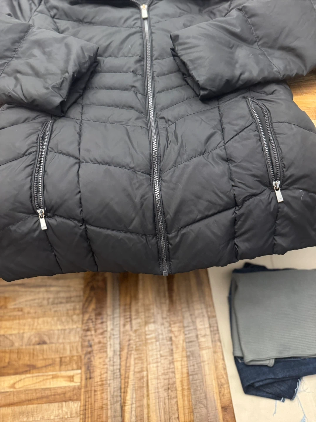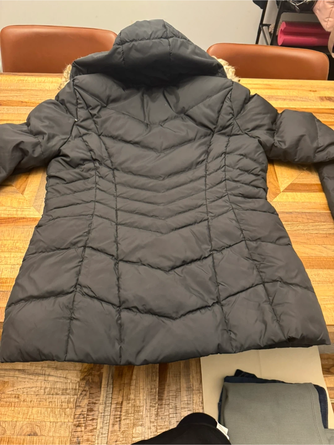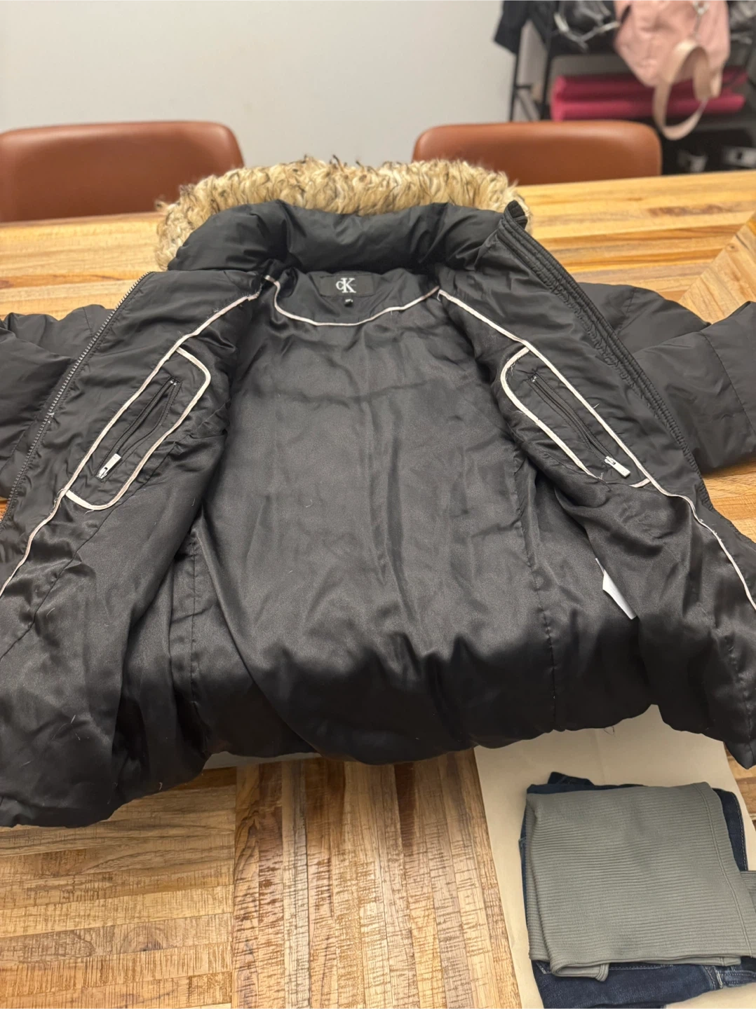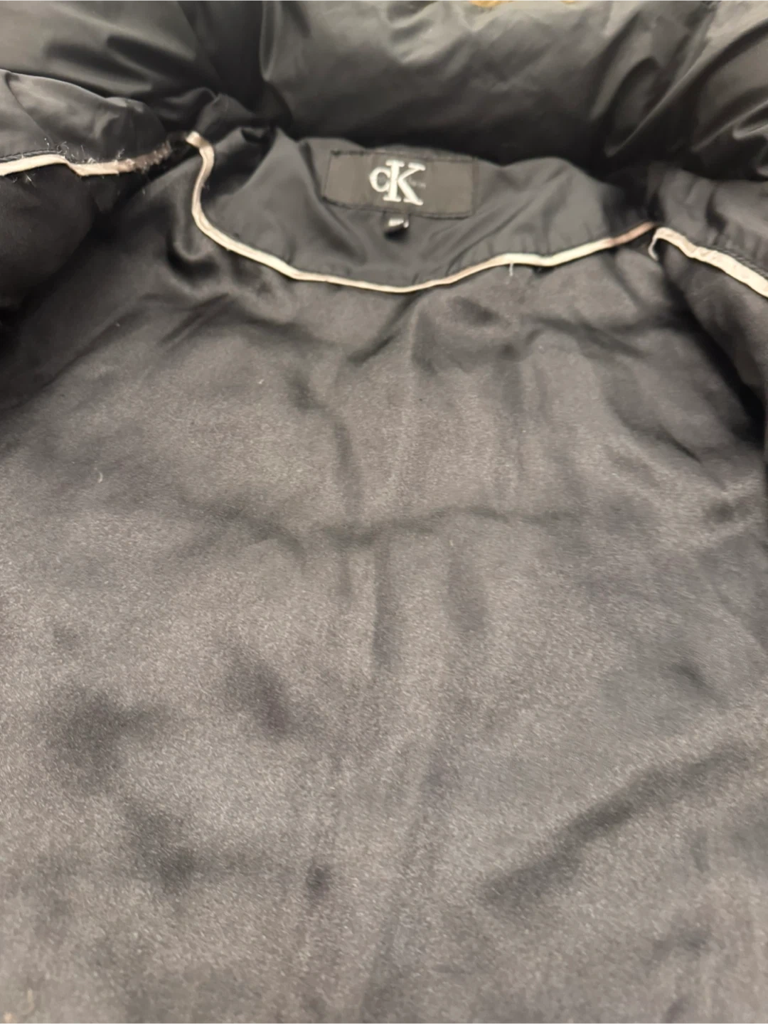 Selling a Calvin Klein black puffer jacket. It's in great condition and has a faux fur-trimmed hood. The size is M/M (Medium/Medium). It's perfect for staying warm during the colder months!