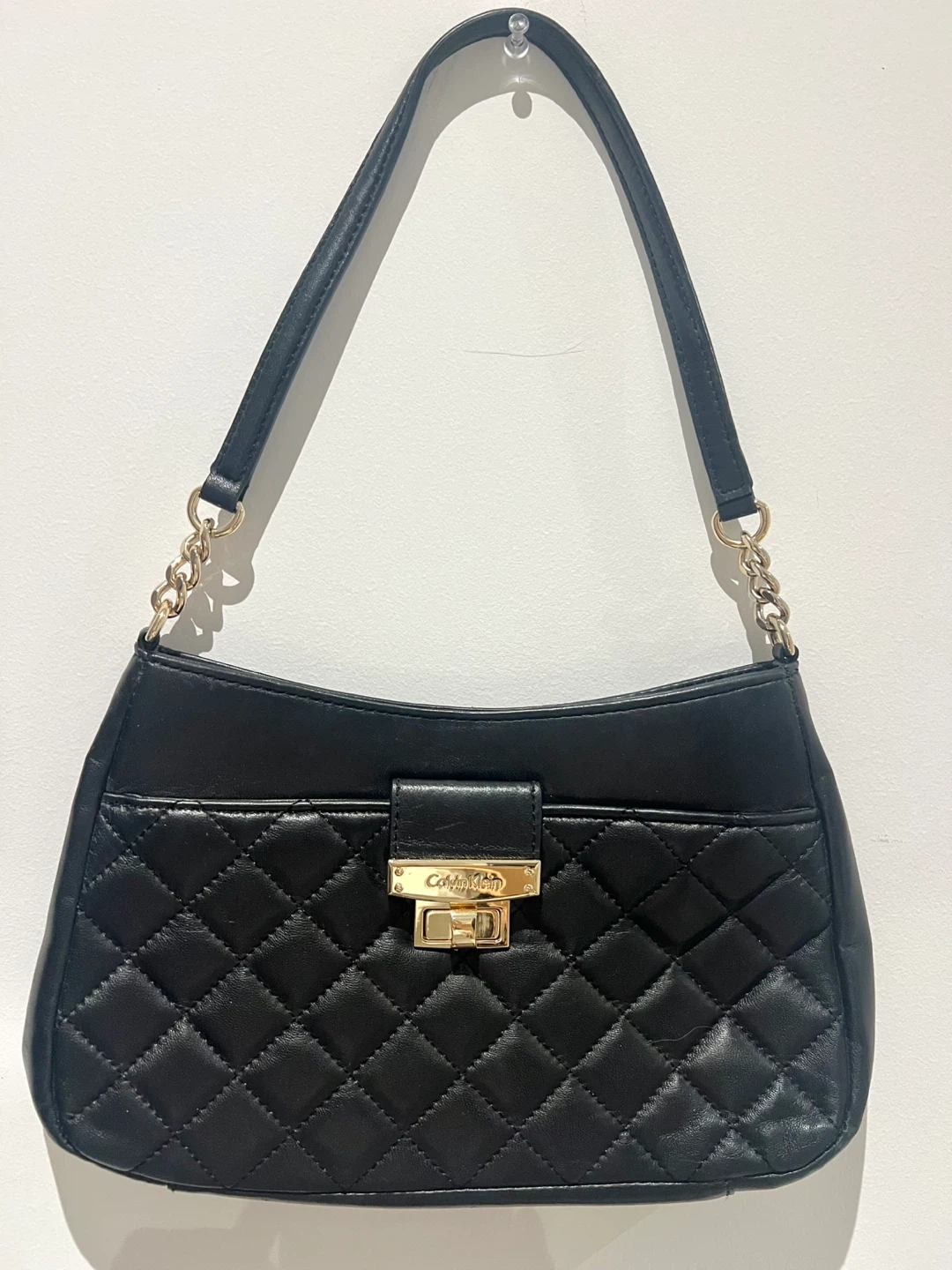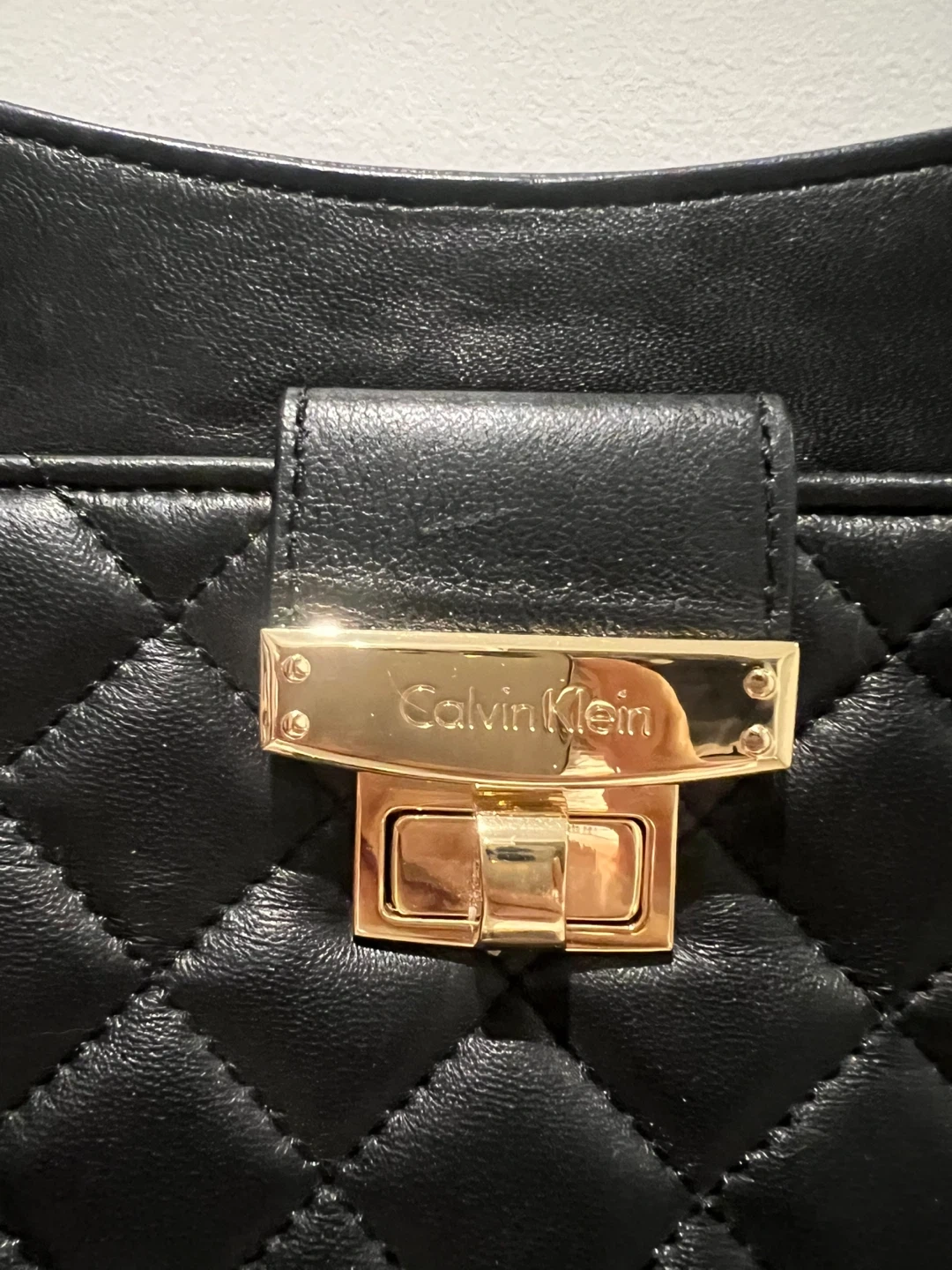 This Calvin Klein shoulder bag features a stylish quilted design. It's black with gold-tone hardware and a chain-link strap. The interior has a logo lining.