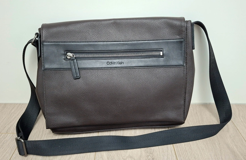 Looking to sell this Calvin Klein messenger bag in brown. It's in great condition and perfect for carrying your essentials around town. The bag features a zippered front pocket and an adjustable shoulder strap for comfortable wear