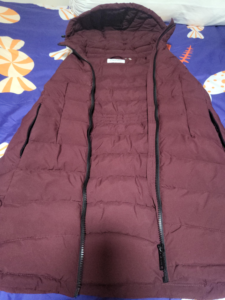 Selling a Calvin Klein burgundy puffer vest! It's in great condition and perfect for layering during the cooler months. The colour is a rich burgundy, and it has a sleek design with black zippers. It's a stylish and practical addition to any wardrobe