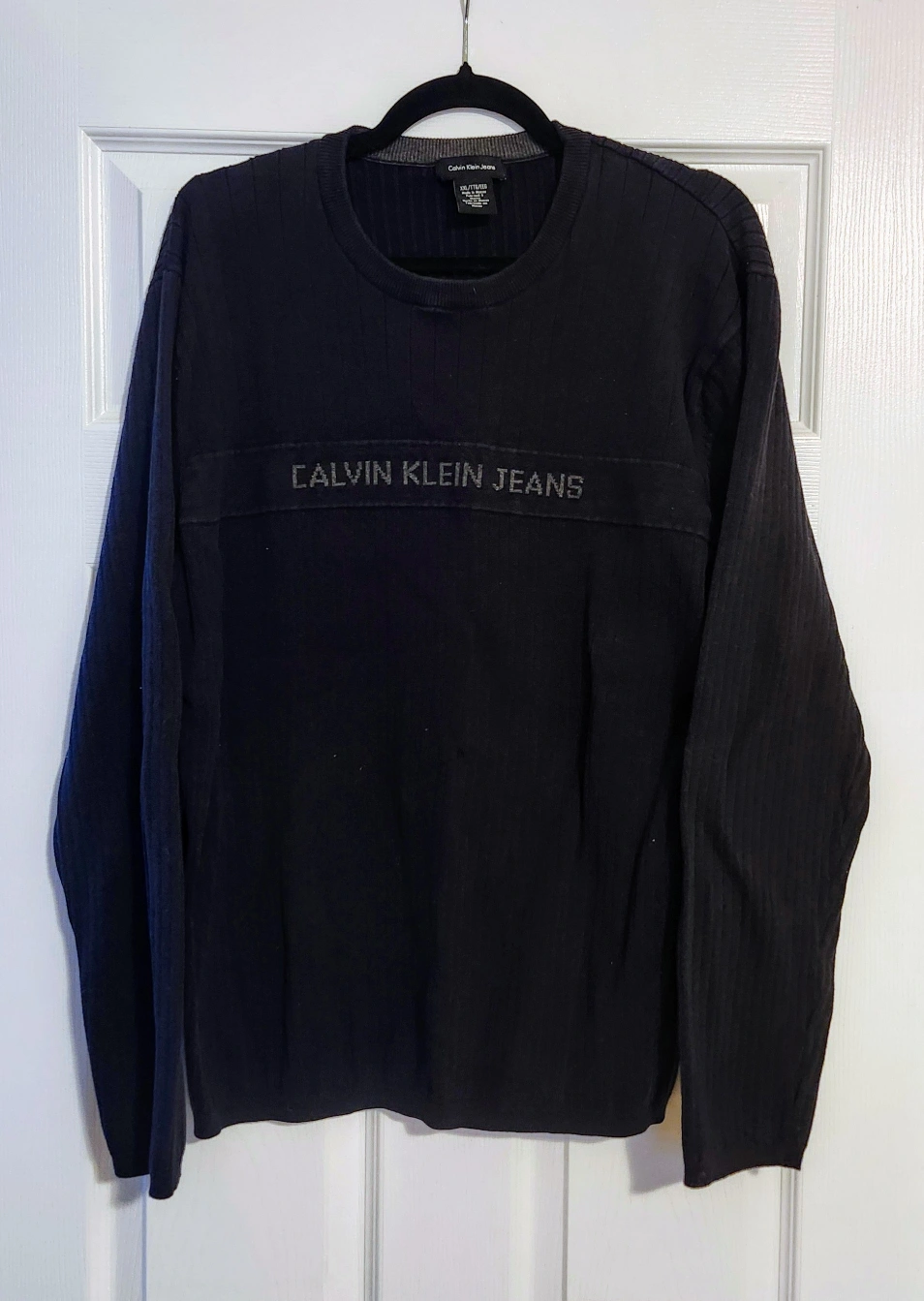 Black ribbed crewneck sweater. Features embroidered Calvin Klein Jeans logo. Long sleeves, relaxed fit.