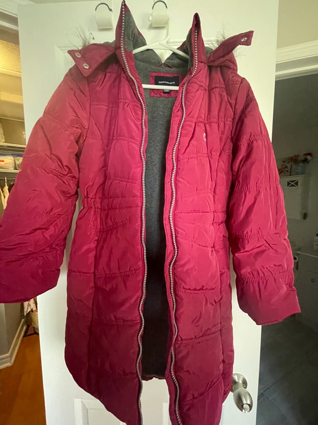 Selling a Calvin Klein Jeans puffer coat in size L/G (12/14). The coat features a faux fur trim on the hood and a comfortable lining to keep you cozy. Great brand, high quality. Wore only a couple of times. In great condition.