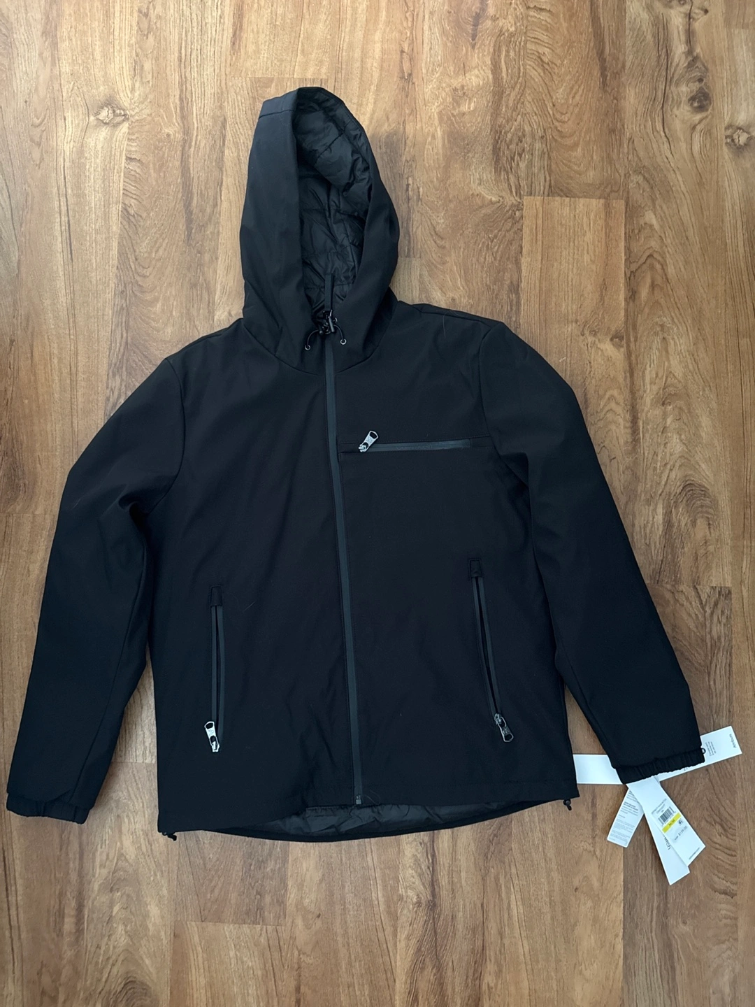 Men's black softshell jacket. Features a hood, zip closure, and multiple pockets. Lightweight and warm. Excellent stretch and flexibility. Wind resistant. New with tags.