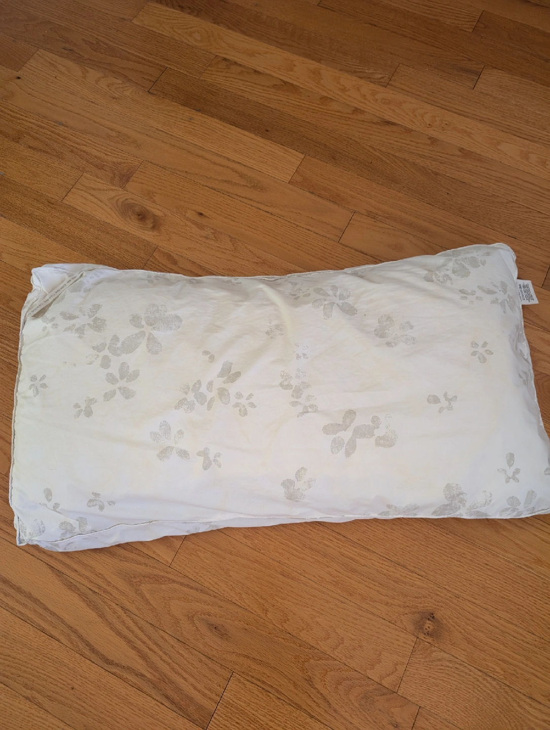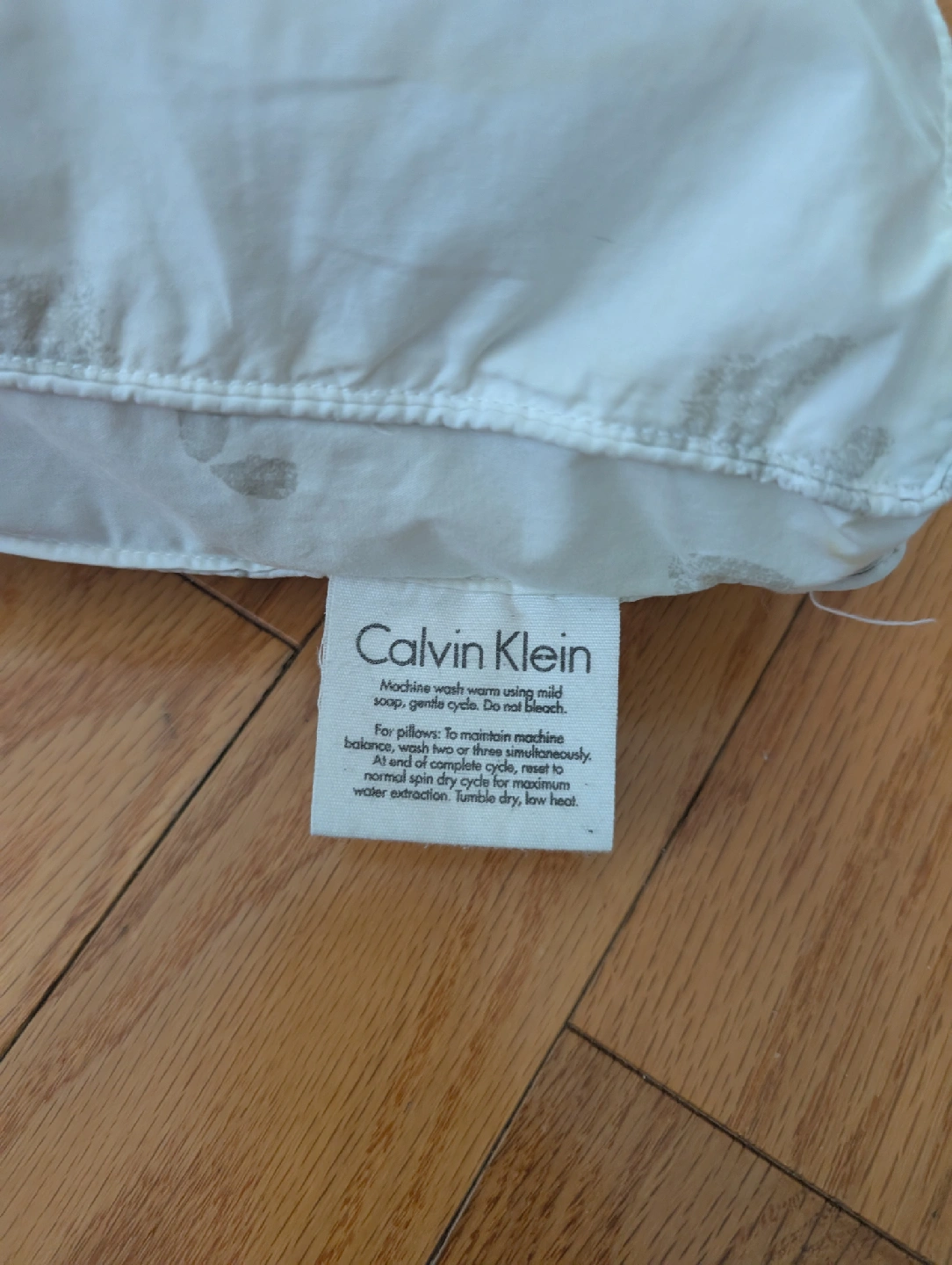 Cozy Calvin Klein pillow, king size, with a subtle floral pattern! It's in good condition. The tag indicates it's machine washable for easy care