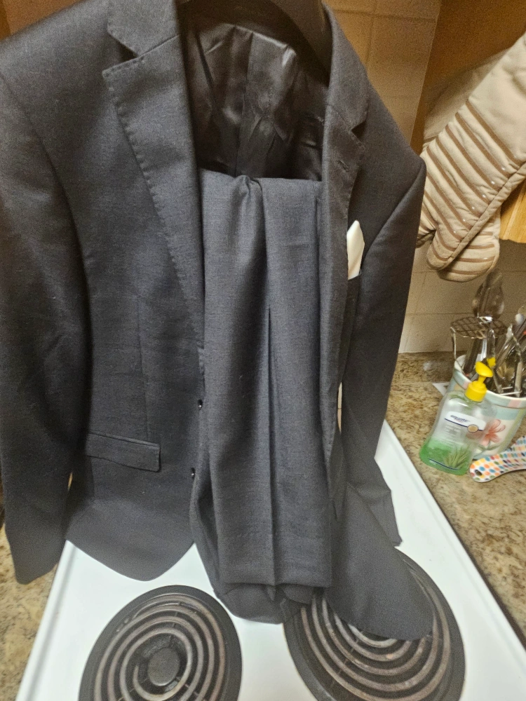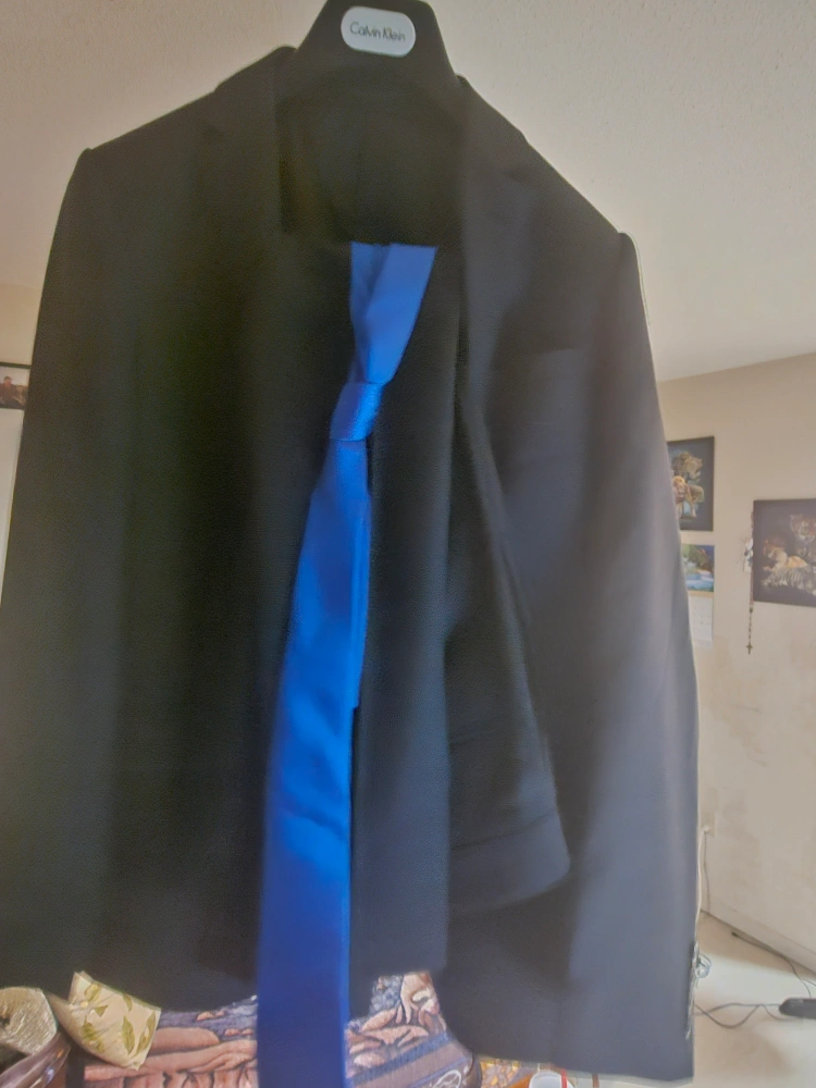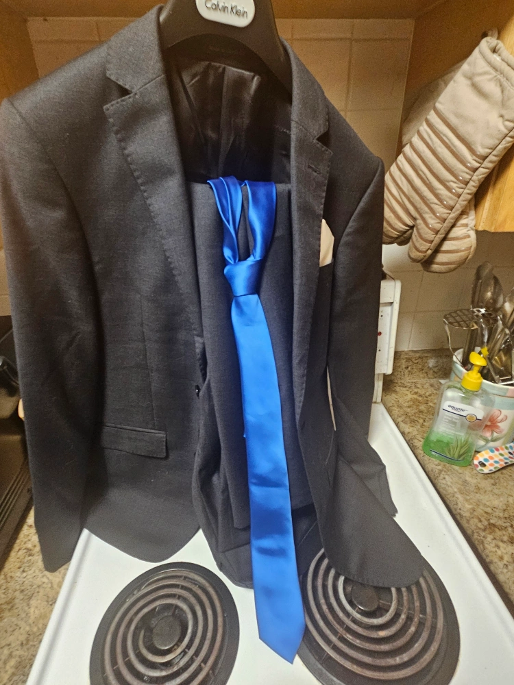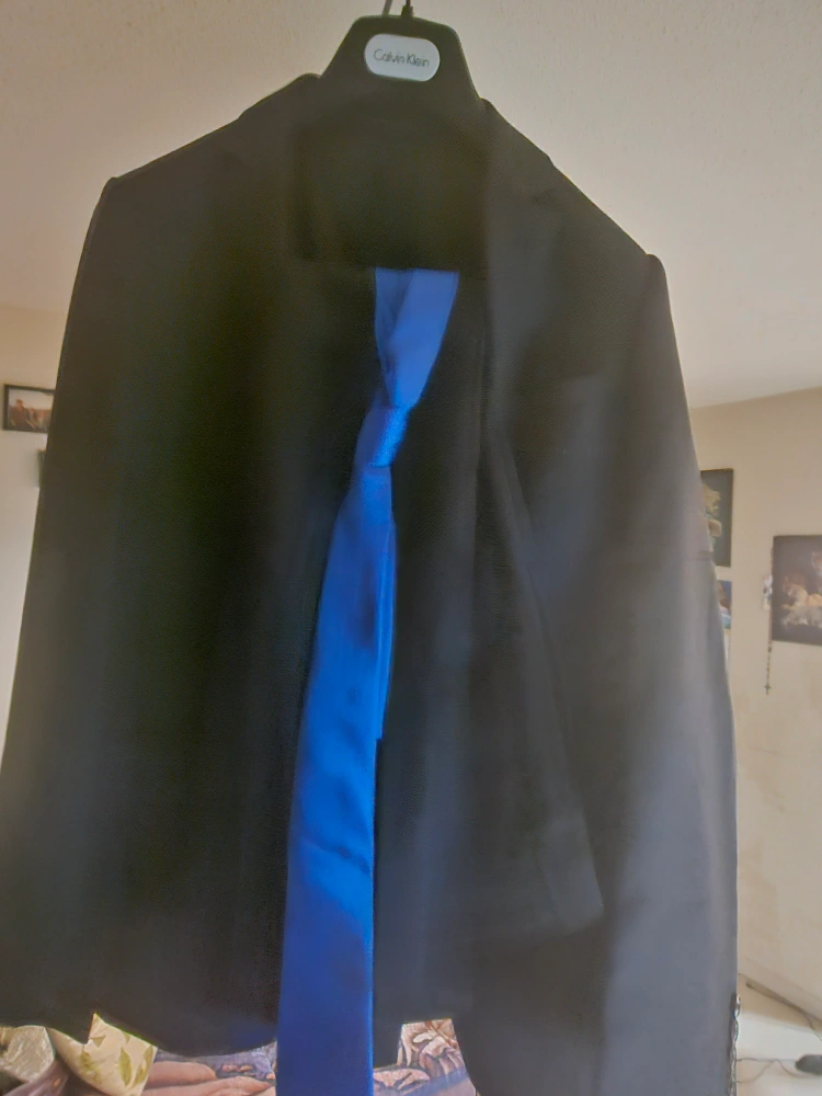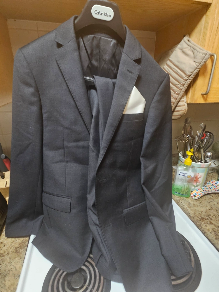 Selling a Calvin Klein suit in black. It's in great condition and ready for a new home! Perfect for interviews, weddings, or any formal occasion. Comes with the jacket and pants. Sorry don't know the size