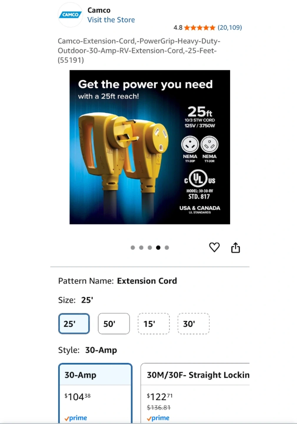 Selling a Camco 25ft heavy-duty outdoor extension cord. It's a 30-Amp RV extension cord and is 25 feet in length. Location: Leduc but can meet half way or deliver past Edmonton for a small fee