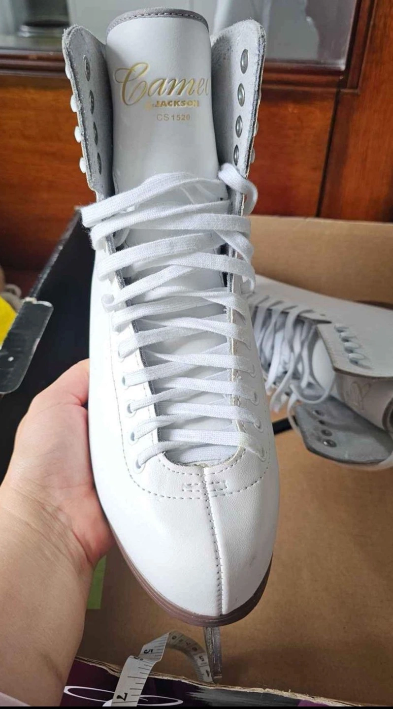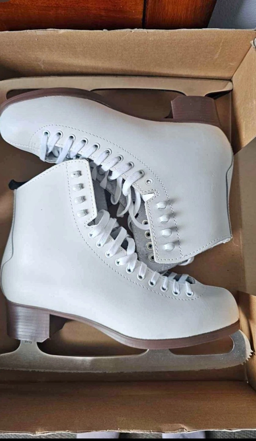 White figure skates. Lace-up style with a leather upper and a brown sole. The skates are in good condition. Worn 2 times and sharpened recently for $8. Size 9 women