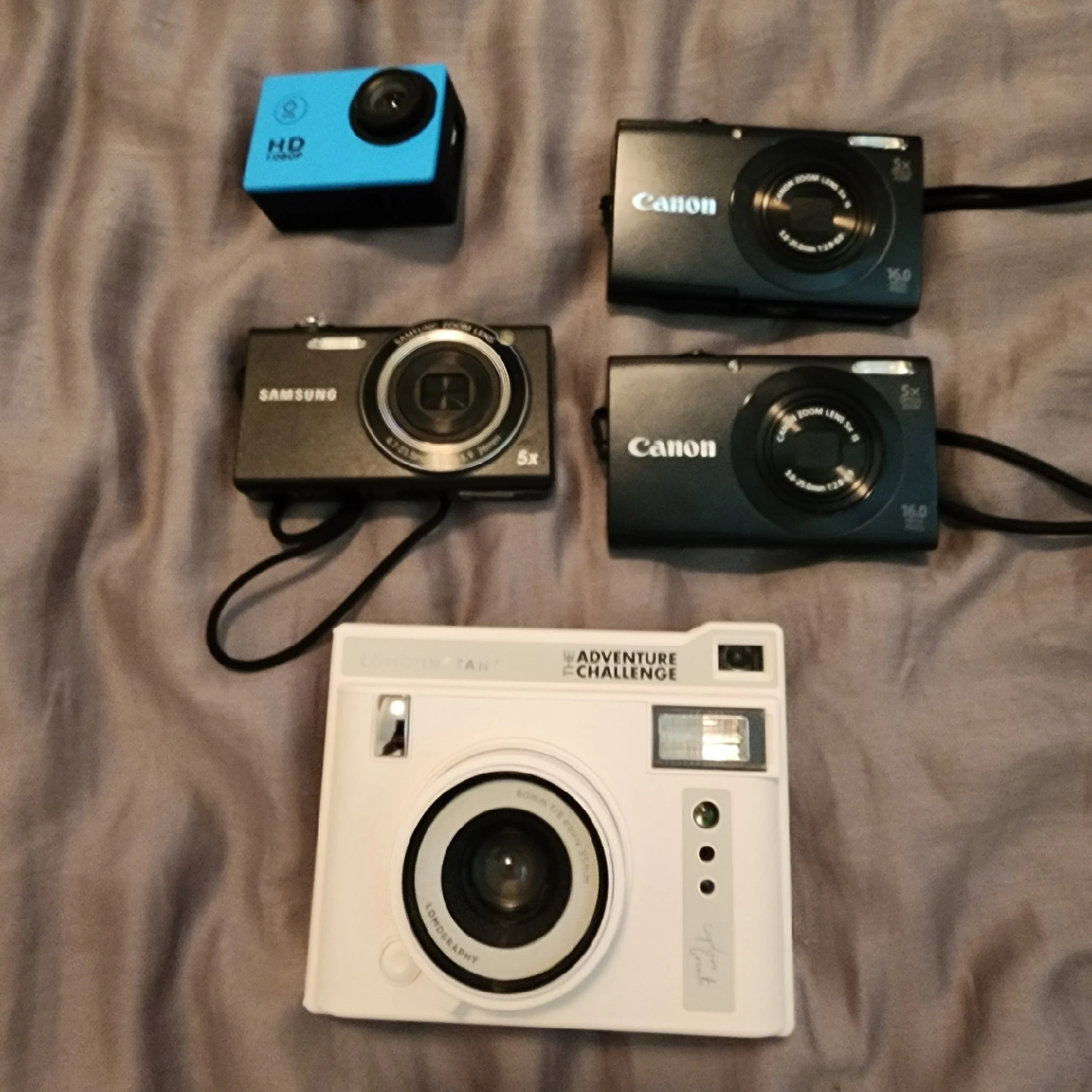 Accepting offers... thx 2x Cannon digital (not charging) 1x Samsung digital (not charging) 1 "go-pro" style 1080p (working) 1x Lomo Instant Polaroid "The Adventure Challenge" with original book "Couples Edition" (working but no film)