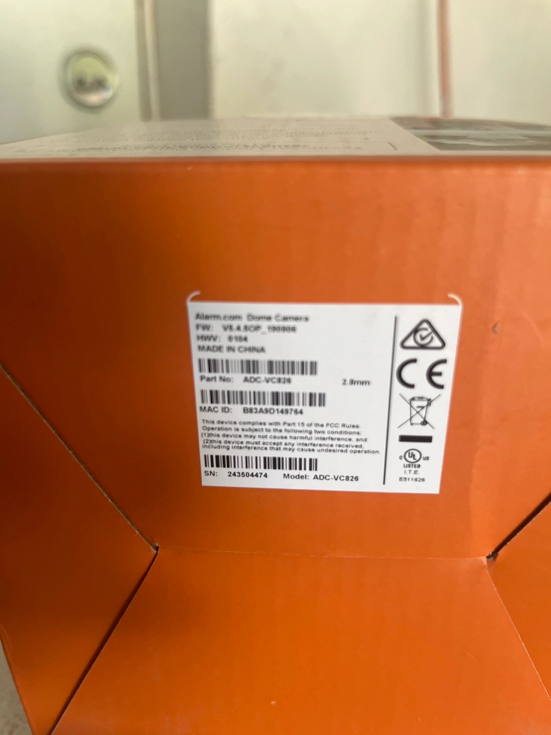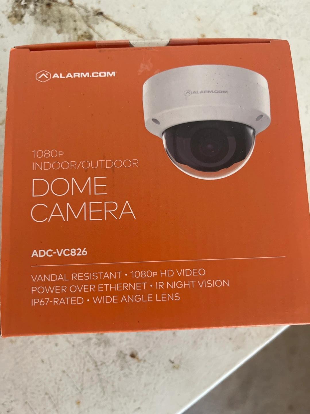 New Alarm.com 1080p indoor/outdoor dome camera. Vandal resistant. Features IR night vision and wide angle lens. Power over ethernet. IP67-rated. Model ADC-VC826.