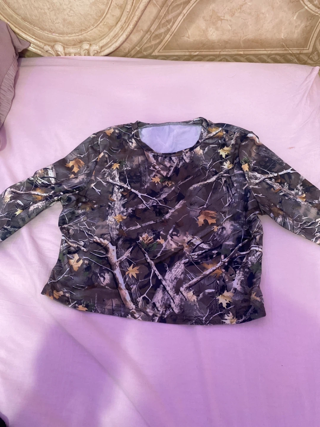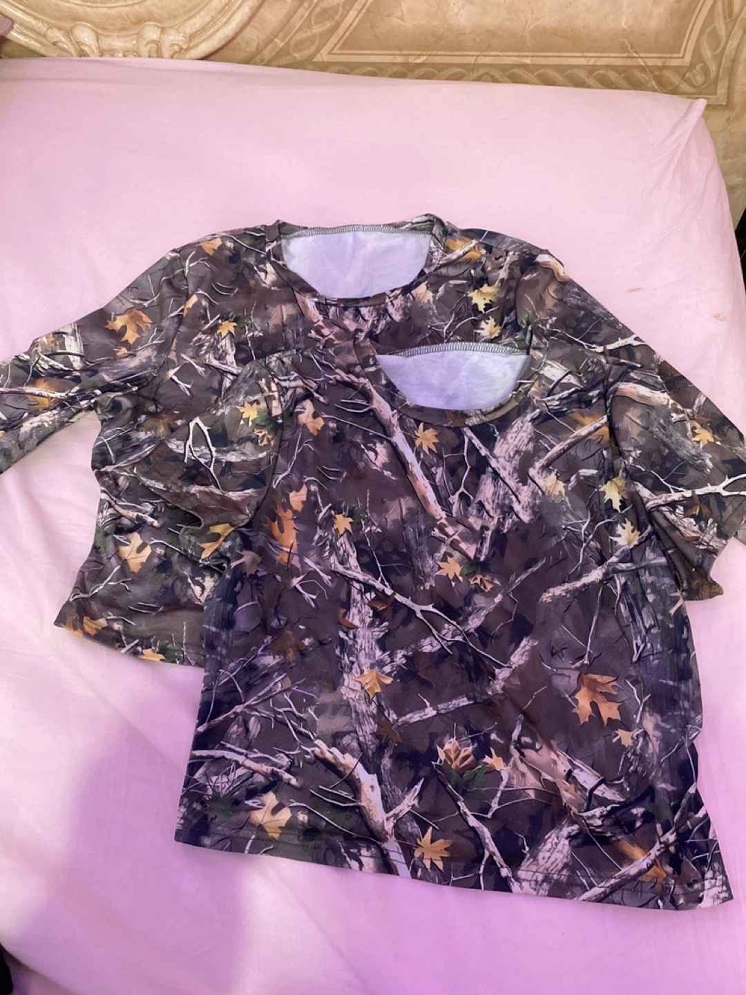Selling a set of camouflage print shirts. One is long-sleeved and the other is short-sleeved. Great for outdoor activities or casual wear.