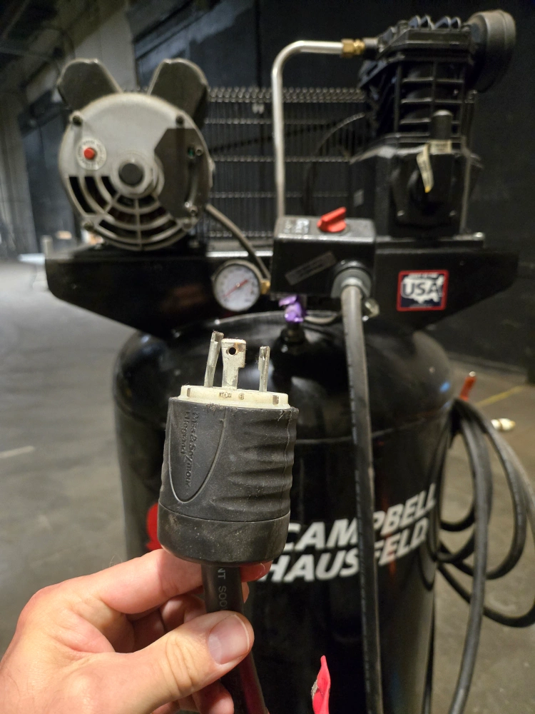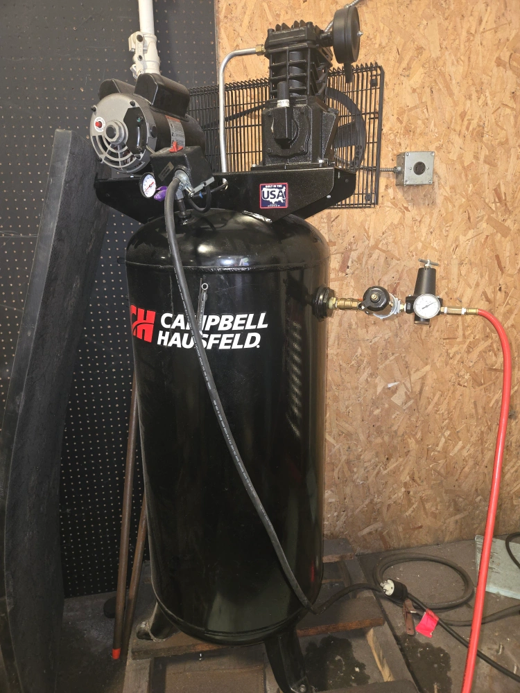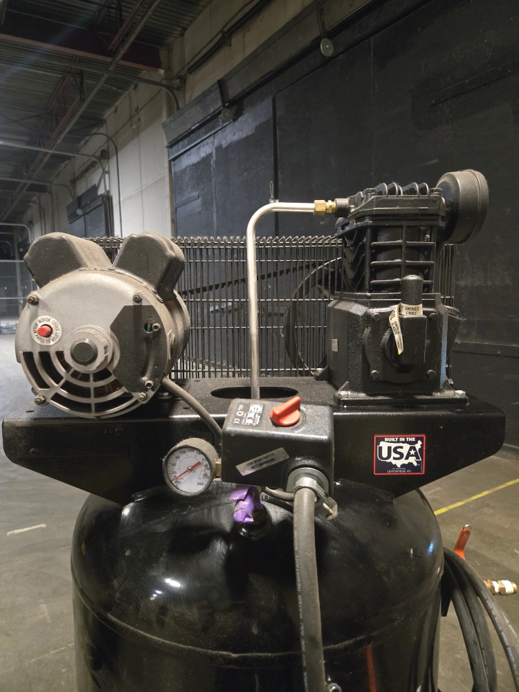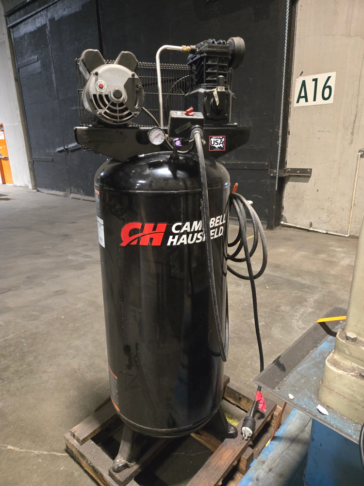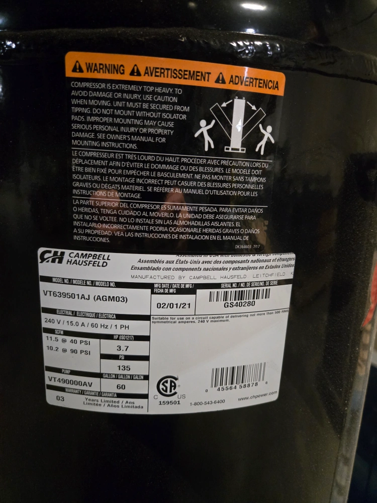 Selling a Campbell Hausfeld air compressor, model VT639501AJ. It's in good working condition and ready for your projects. This unit is built in the USA and has a 60-gallon tank. It operates at 240 V and 15.0 A at 60 Hz. It delivers 11.5 CFM at 40 PSI and 10.2 CFM at 90 PSI. The manufacturing date is 2021 February 01