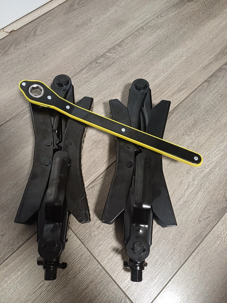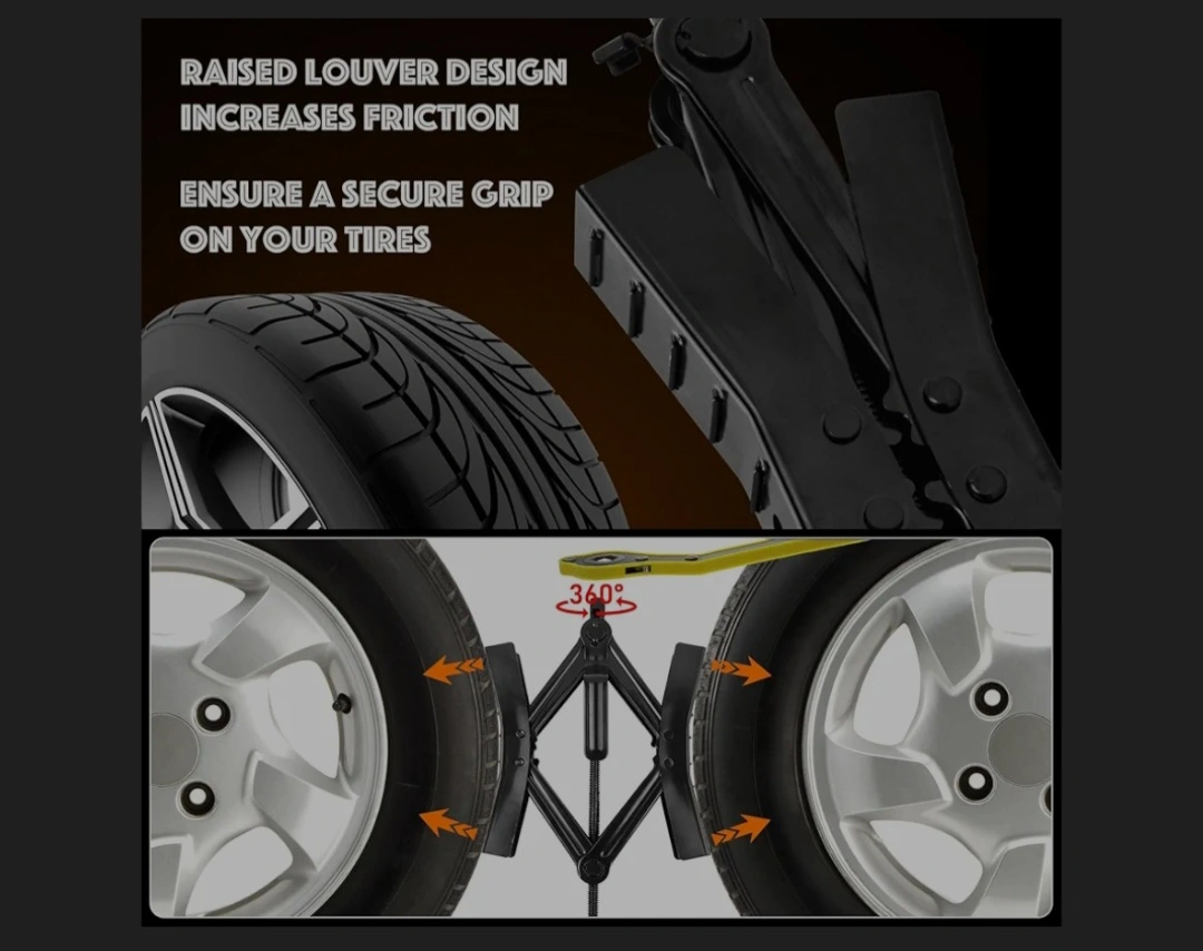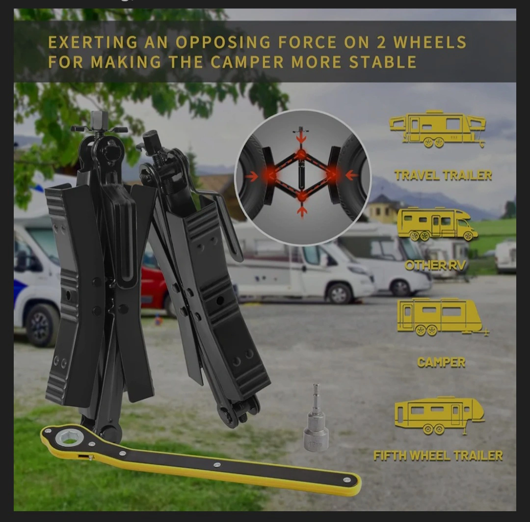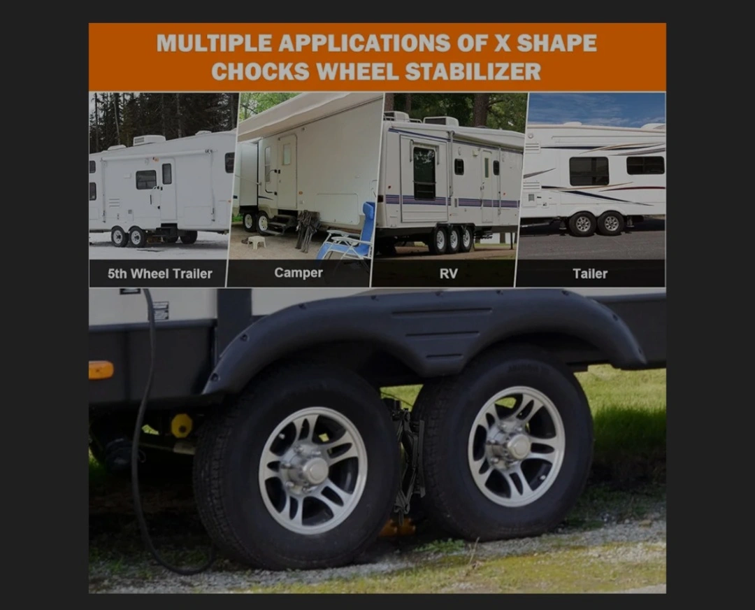 Selling a pair of tire traction devices/ heavy duty tire locking chock RV camper accessories with wrench, anti-move x-shape wheel chocks for travel trailers. They come with a ratchet to help secure them to your tires. Anti-rust coating. Fit for 3.5" to 12".