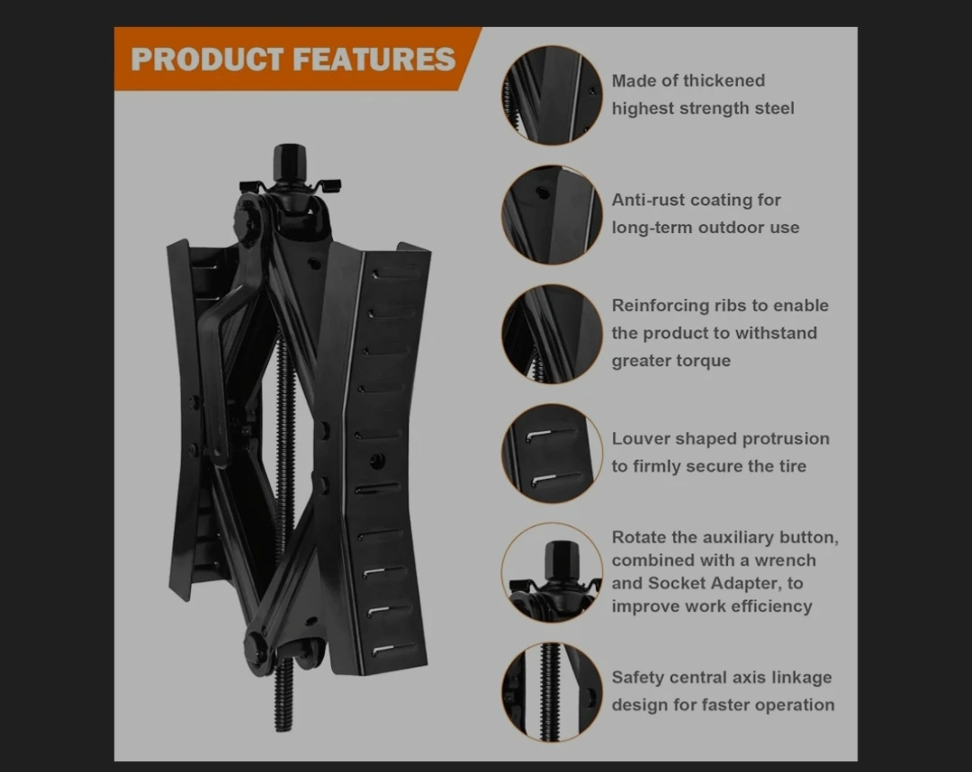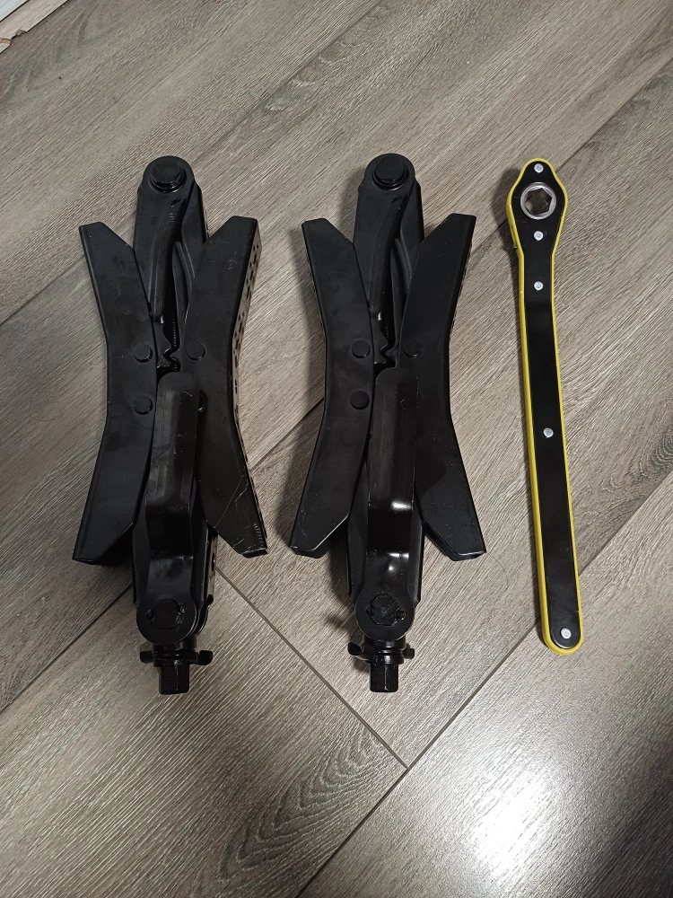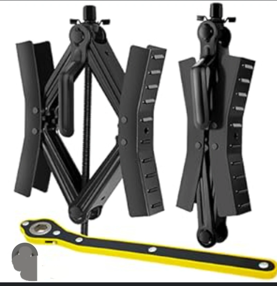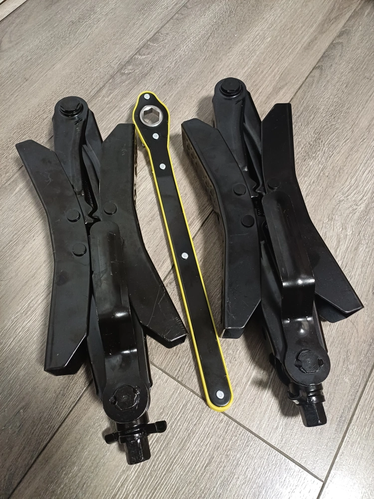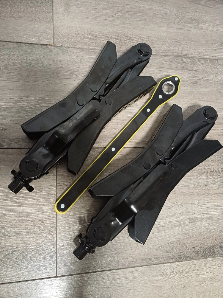 Selling a pair of tire traction devices/ heavy duty tire locking chock RV camper accessories with wrench, anti-move x-shape wheel chocks for travel trailers. They come with a ratchet to help secure them to your tires. Anti-rust coating. Fit for 3.5" to 12".