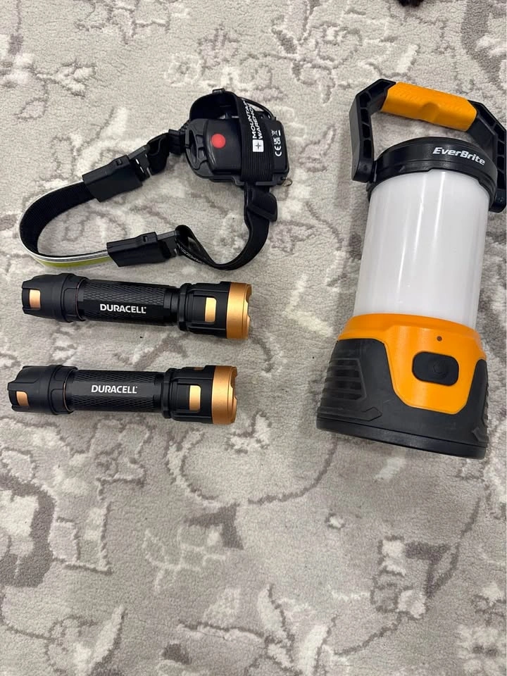 Bundle of lights, perfect for camping, hiking, or emergency use: • 2x Duracell heavy-duty flashlights • 1x LED headlamp (adjustable strap) • 1x EverBrite LED lantern with handle(also can be used as power bank) All in good working condition. Reliable and bright! All must go together 📍 Pick up at 16th & Kingsway.