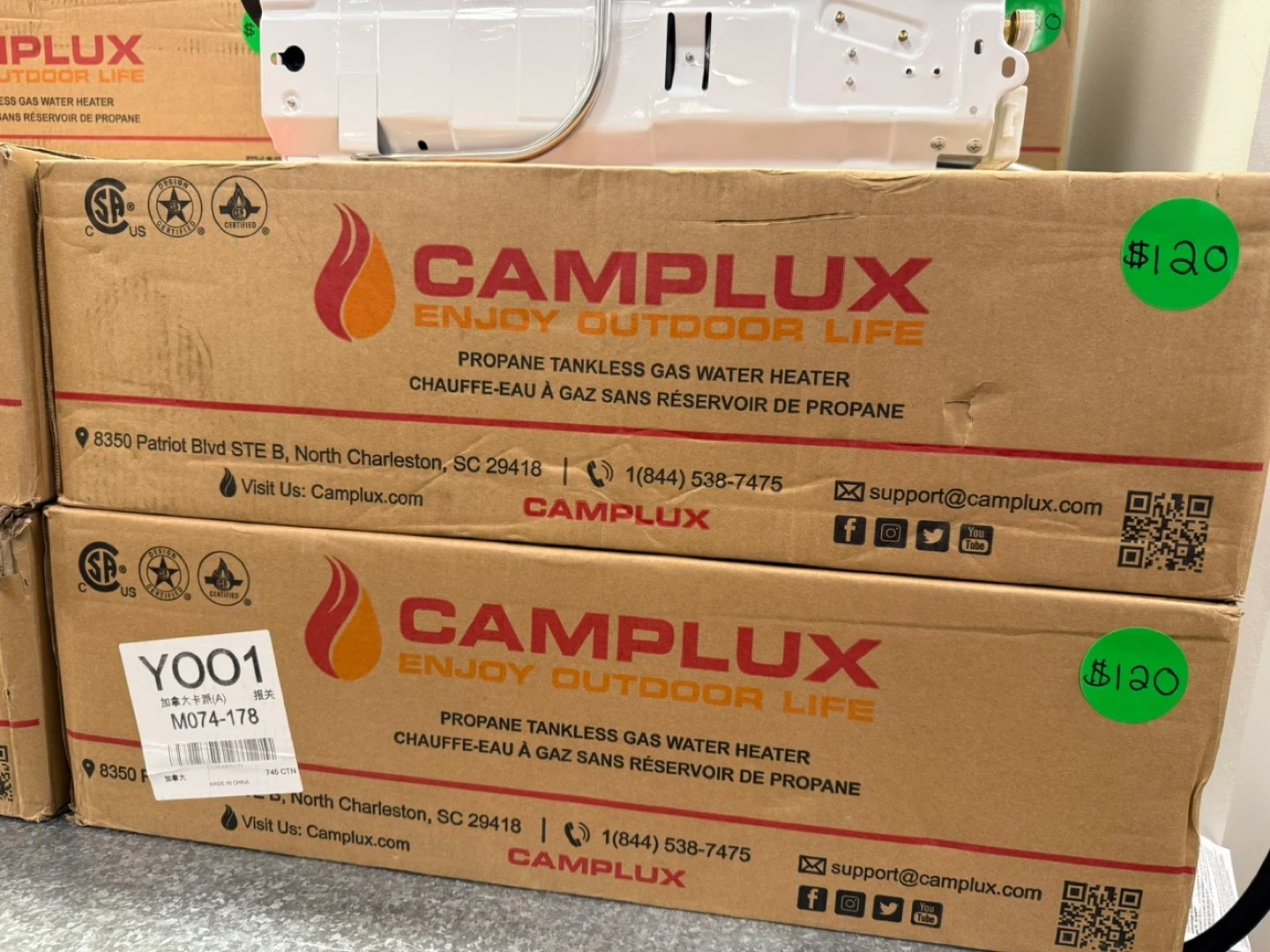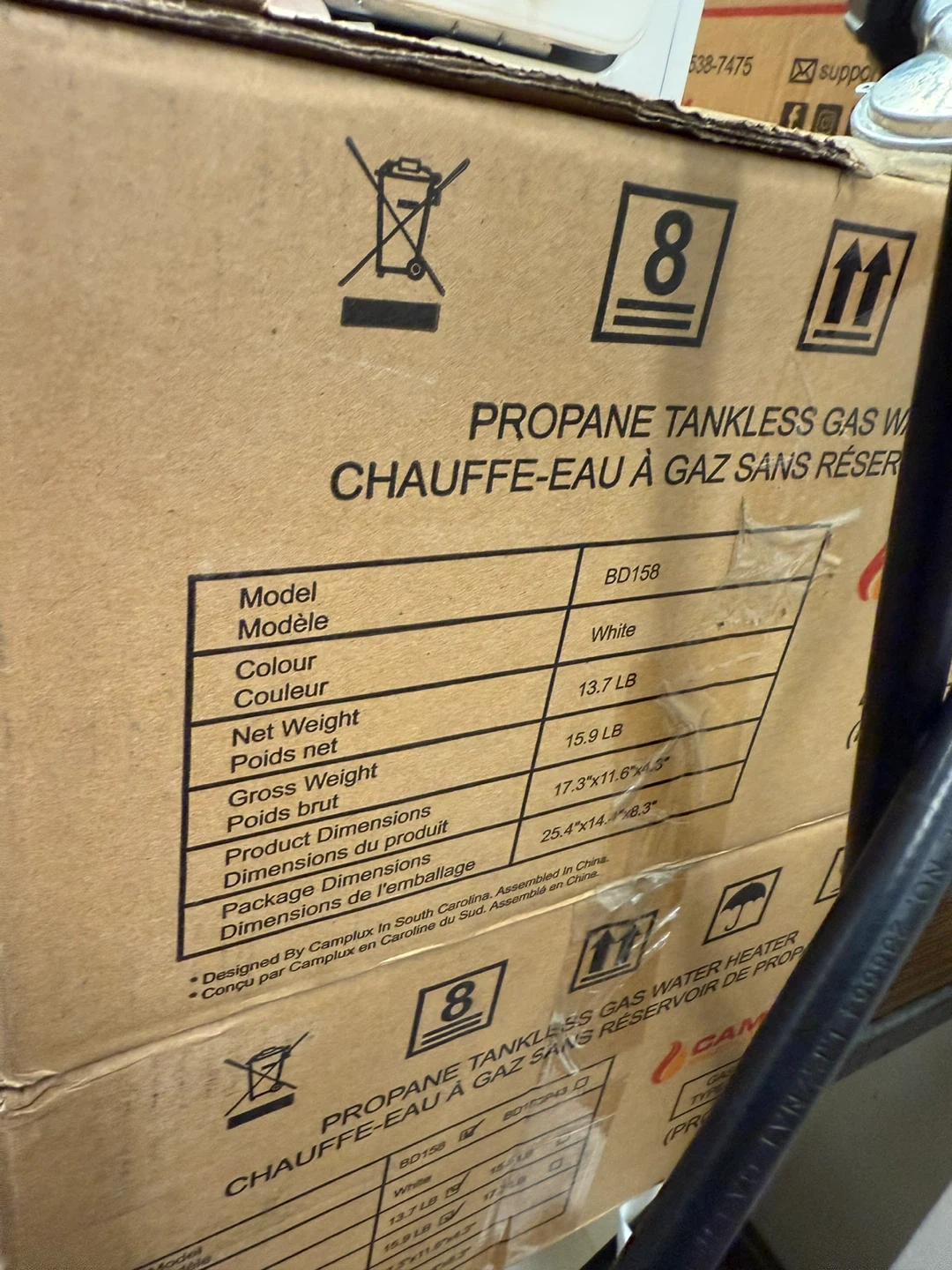 Selling a brand new Camplux BD158 propane tankless water heater! It's white and comes in its original box. The product dimensions are 25.4" x 14.4" x 8.3".