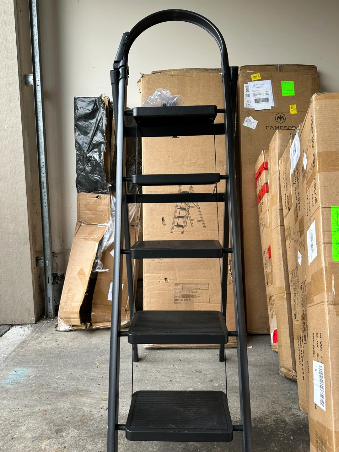 Selling a Campsor 5-step ladder in black. It's in great condition and ready to help with all your tasks around the house! Brand new in box, got 5 available