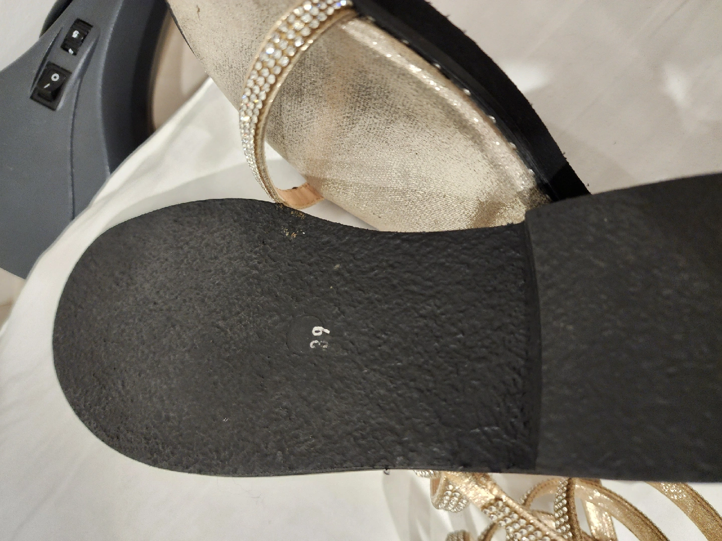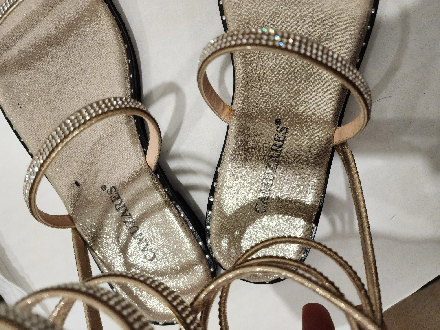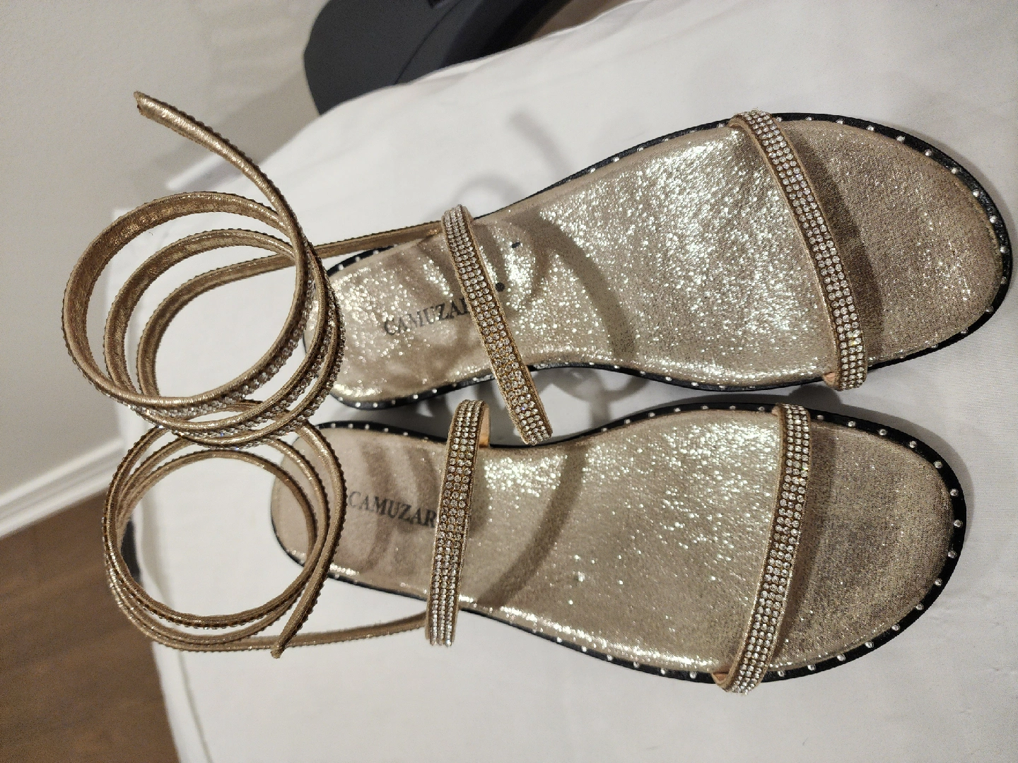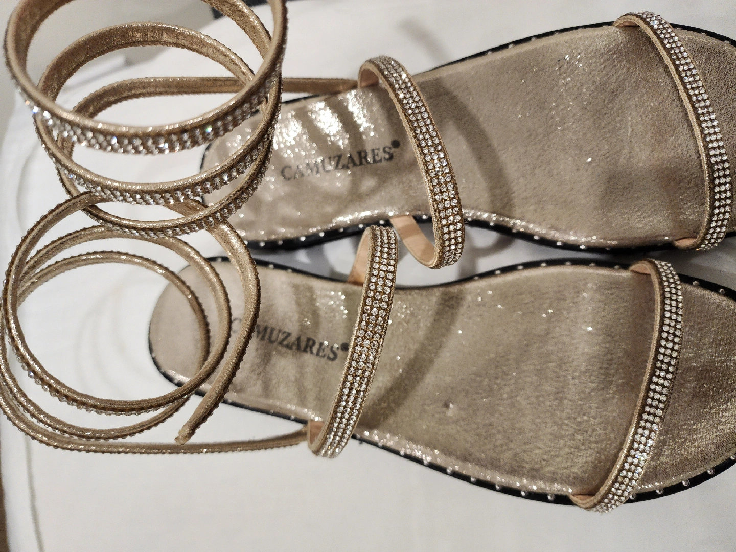 Selling a pair of Camuzares gold sandals in size 39! These sandals feature a sparkly strap design and a unique wrap-around ankle strap. They're perfect for adding a touch of glam to any outfit!