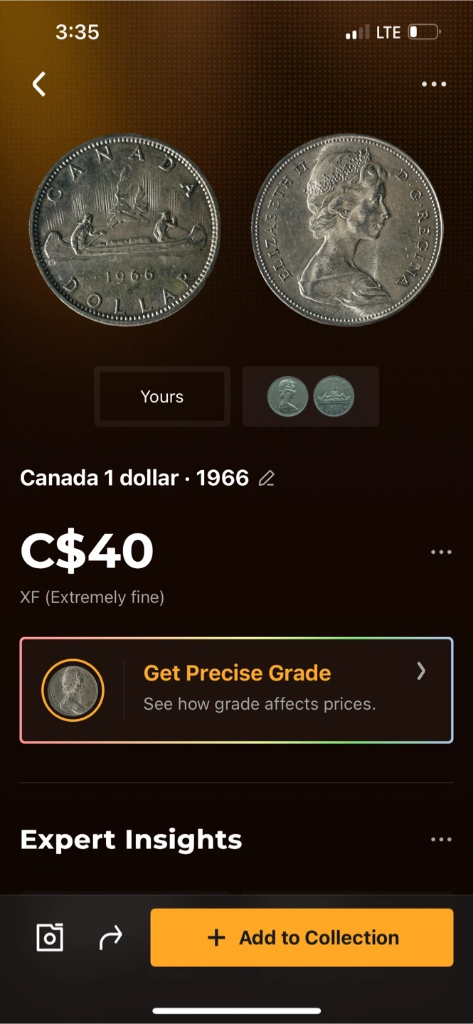 Selling a Canada 1 dollar coin from 1966. It's graded as XF (Extremely Fine) and would be a great addition to any collection!