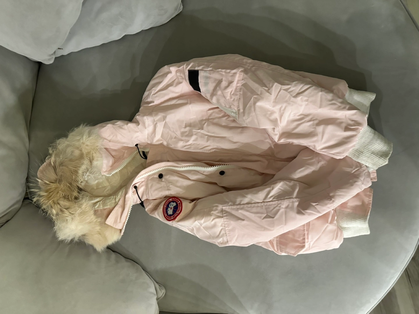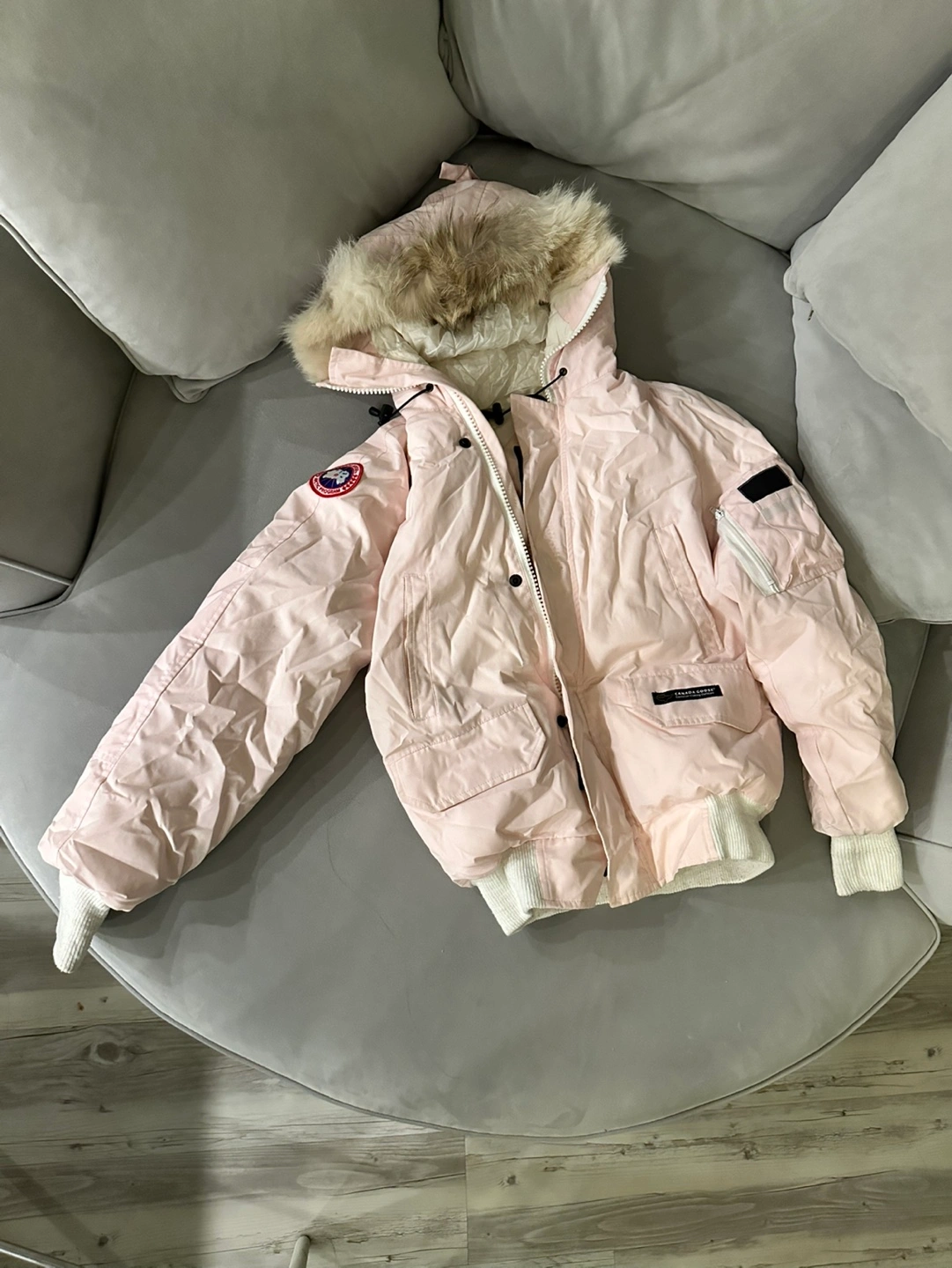 EUC authentic Canada Goose bomber jacket. Blush colour. Features a fur-trimmed hood and ribbed cuffs. Excellent warmth and style.