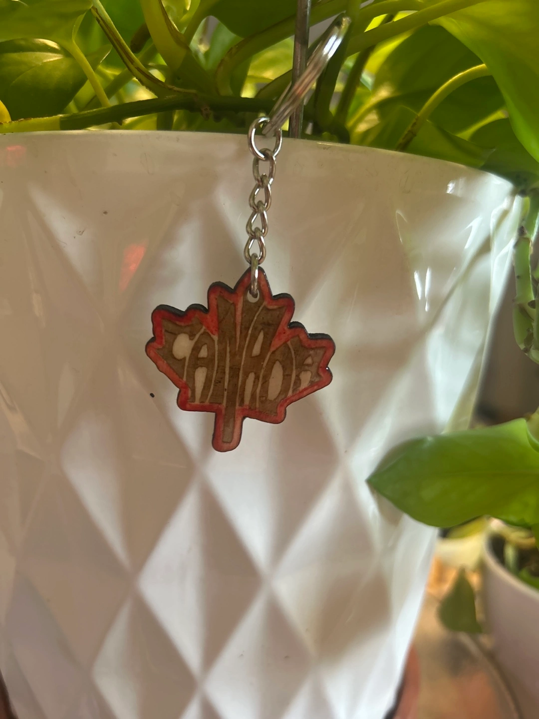 Here's a cute Canada maple leaf keychain! It's perfect for showing off your Canadian pride or as a souvenir