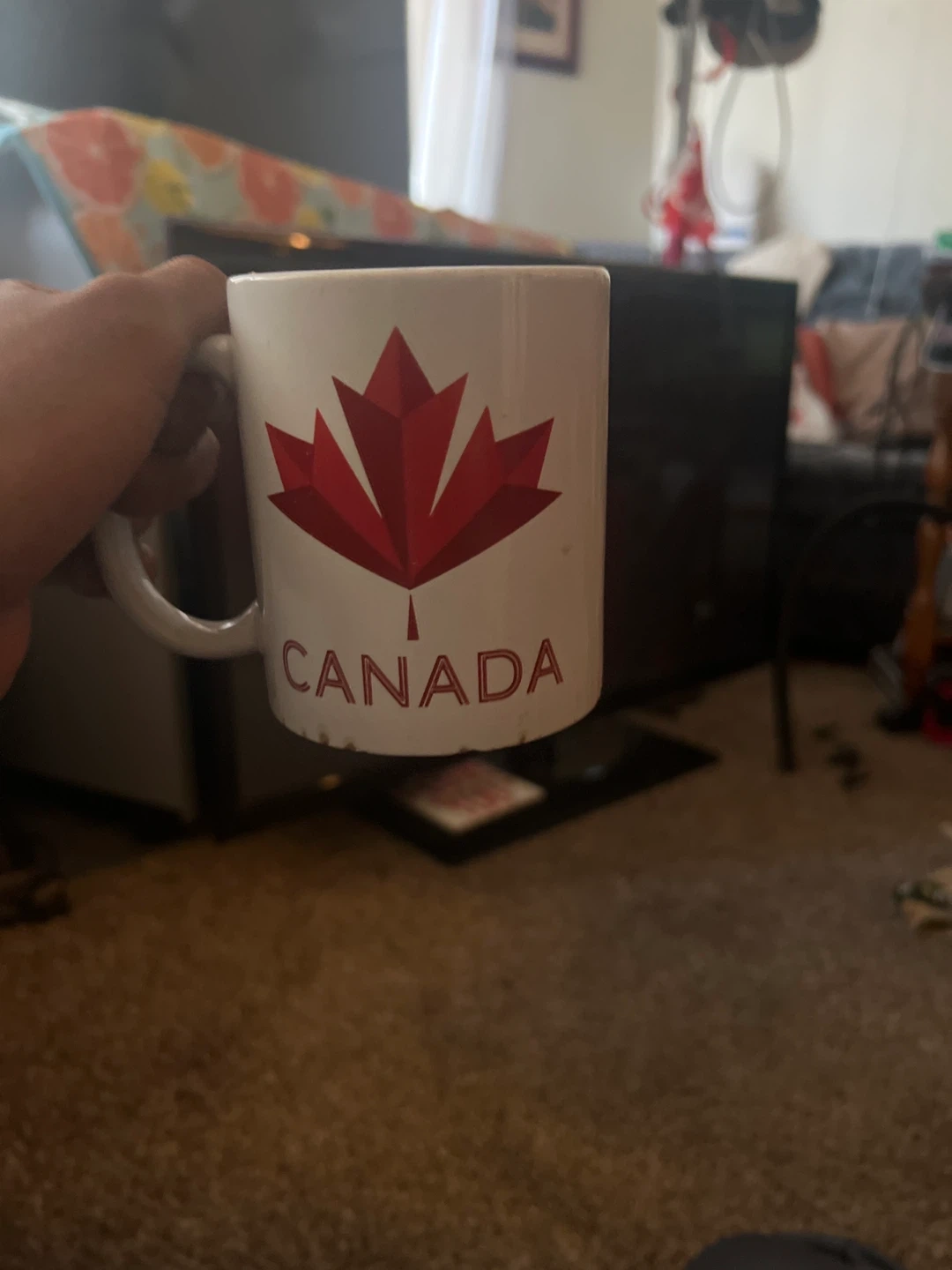 Selling a mug with a red maple leaf design and the word "CANADA" printed on it! It's perfect for showing your Canadian pride or enjoying a warm beverage. There are some signs of wear on the bottom of the mug, but it's still in good usable condition