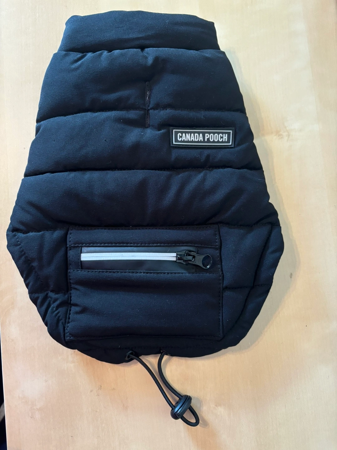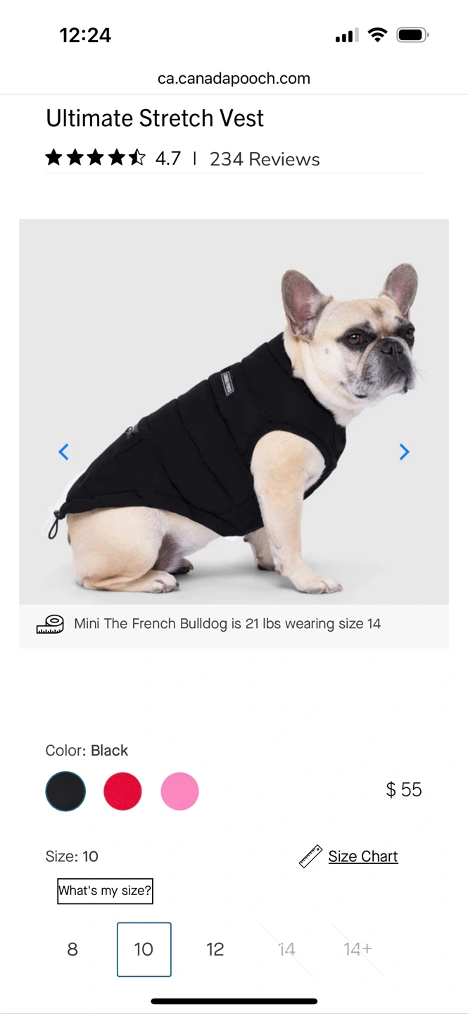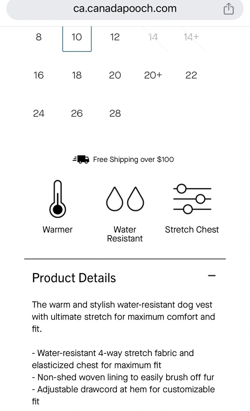 Size 10. (See sizing chart in photos!) Black Canada Pooch Winter Coat. So warm!! Sadly it’s too small for my dog. Unable to return. Size 10. Ultimate Stretch Vest. Small zippered pocket. Adjustable drawstring at bottom. Spot for harness/leash access. Machine washable. Porch pick up