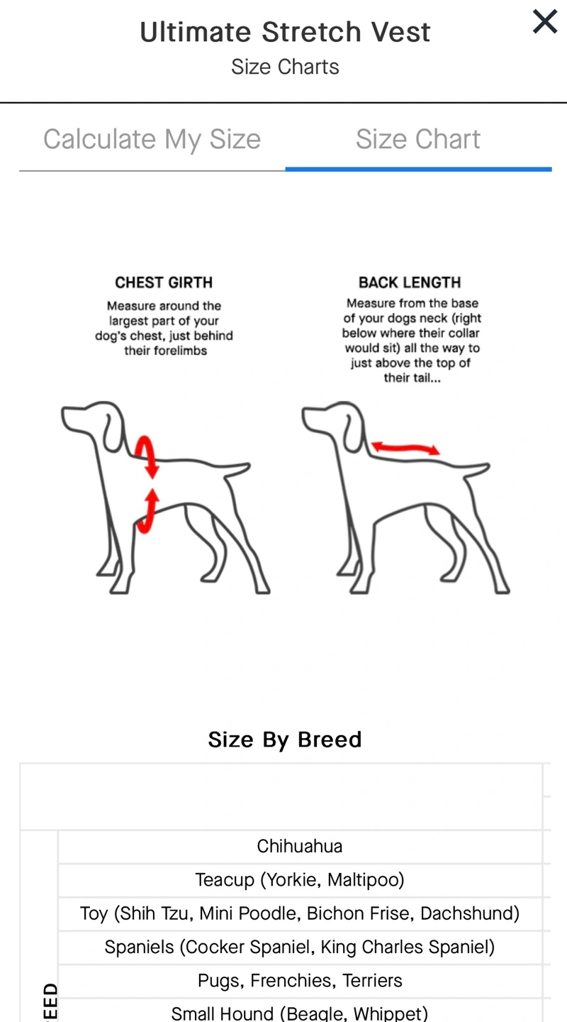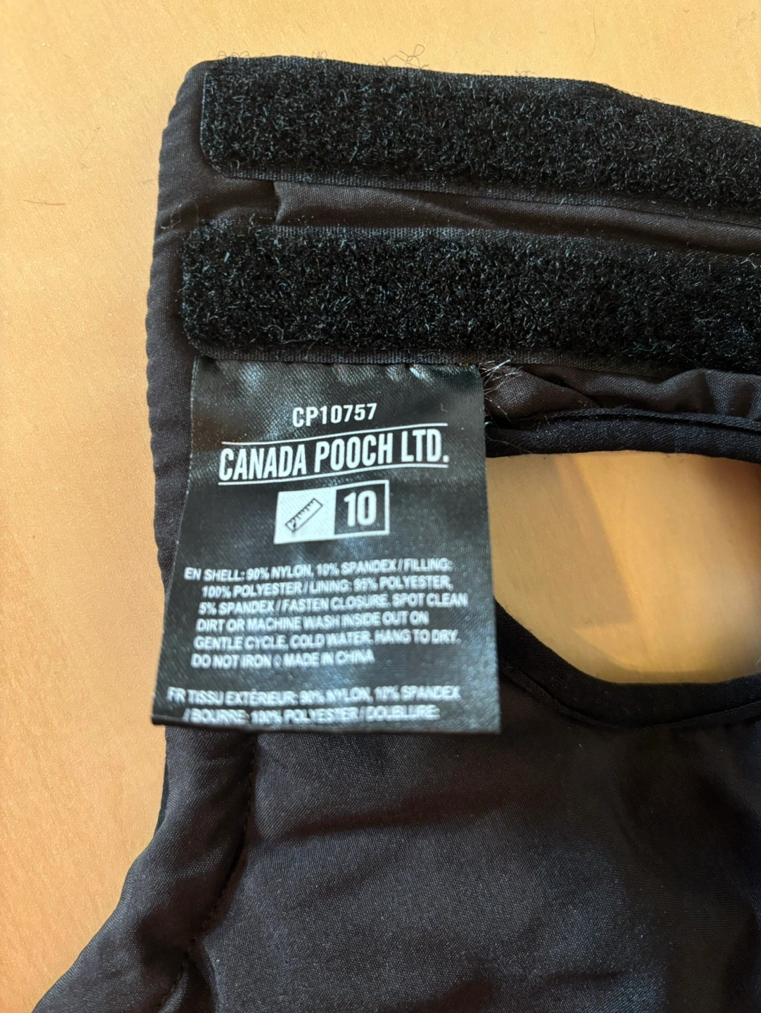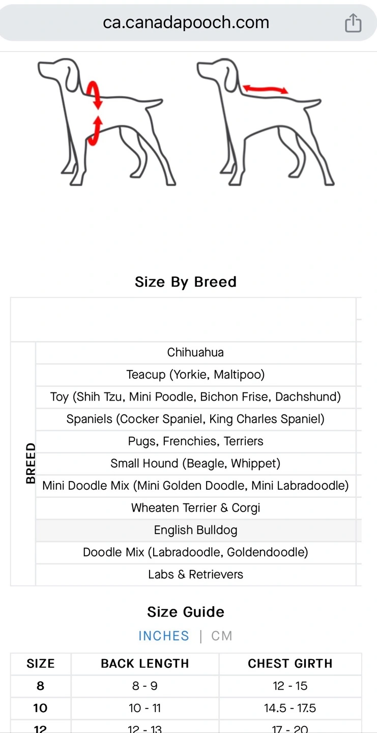 Size 10. (See sizing chart in photos!) Black Canada Pooch Winter Coat. So warm!! Sadly it’s too small for my dog. Unable to return. Size 10. Ultimate Stretch Vest. Small zippered pocket. Adjustable drawstring at bottom. Spot for harness/leash access. Machine washable. Porch pick up
