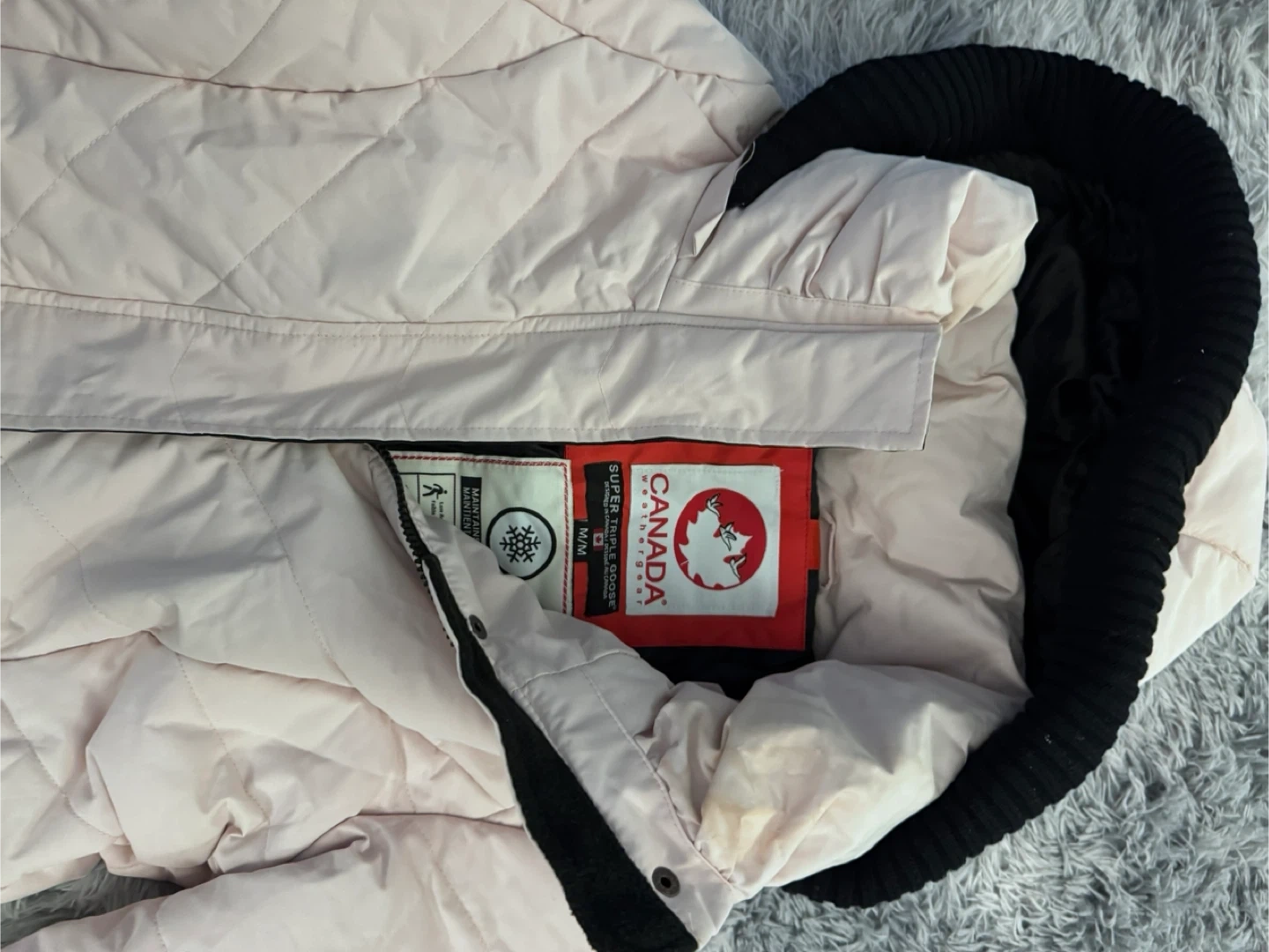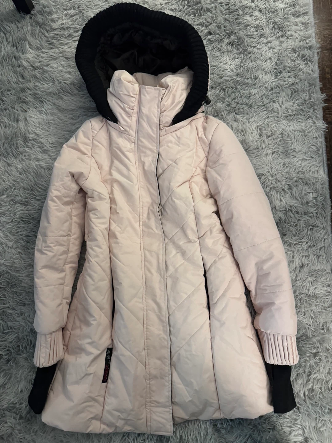 Selling a Canada Weather Gear puffer jacket in size medium! It's a lovely light pink colour with a black hood and detailing. Perfect for keeping warm during the colder months.