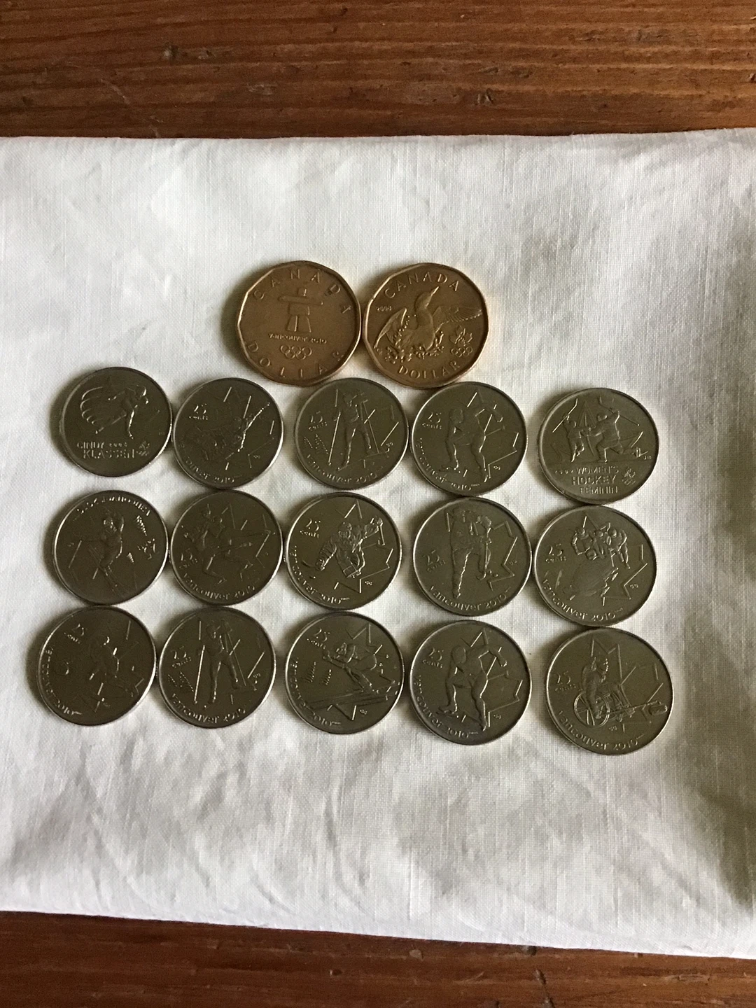 A collection of Canadian coins, including two loonies and a set of 2010 Vancouver Olympics commemorative 25-cent coins! Great for collectors or anyone interested in Canadian currency and Olympic memorabilia